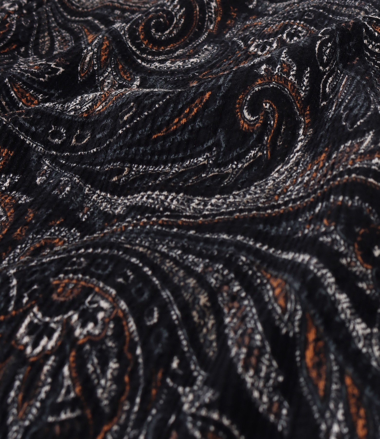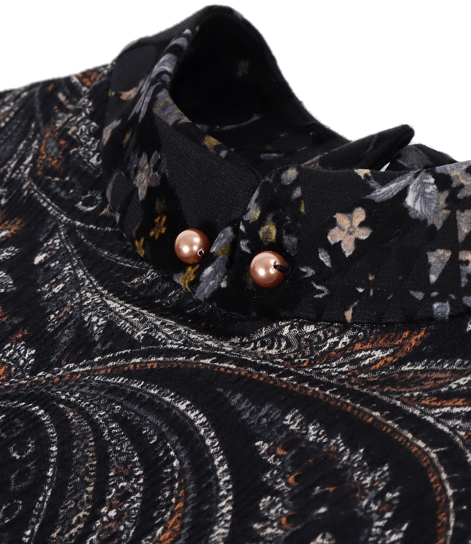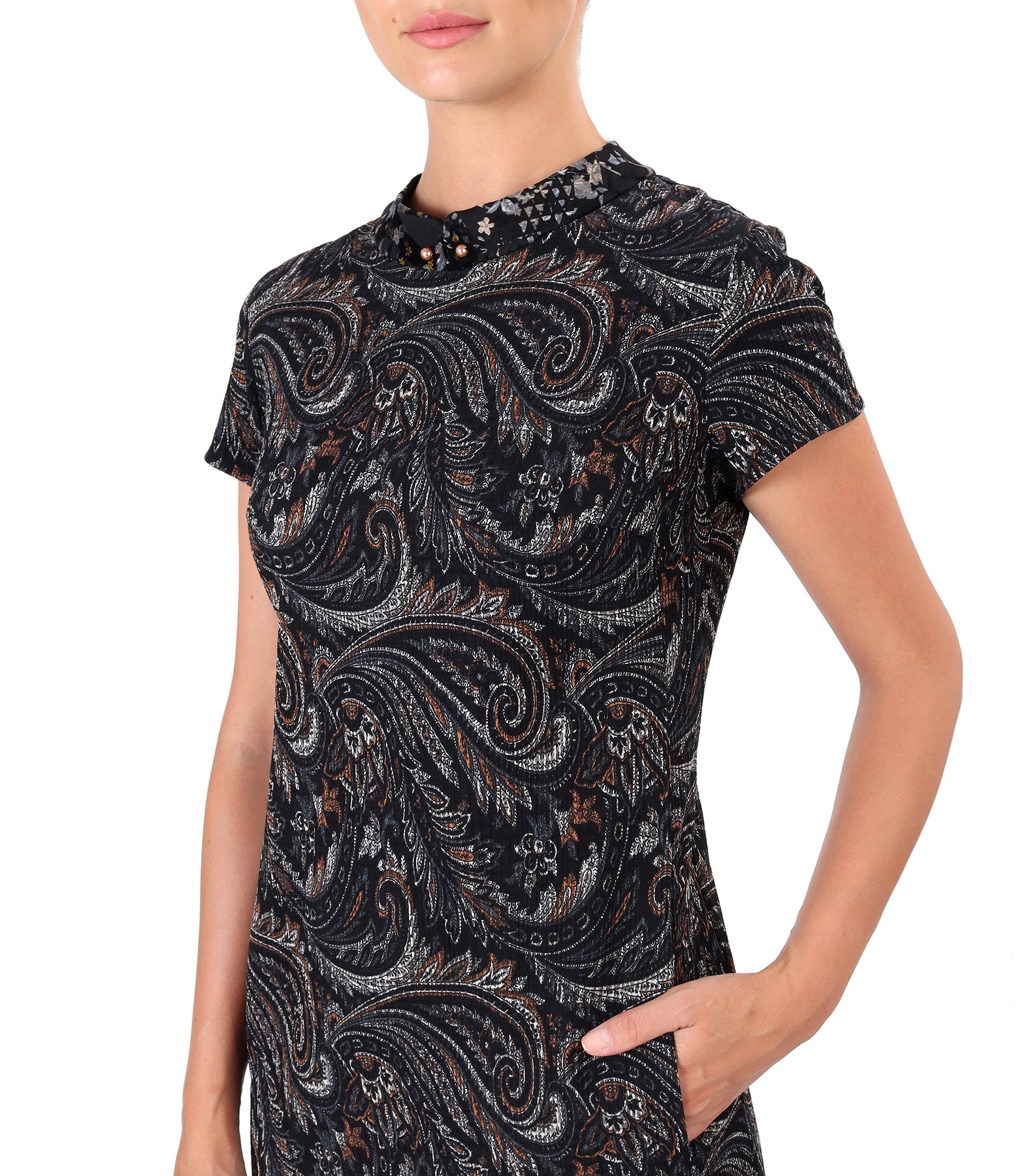 Midi dress made of elastic brocade with embossed ribs and paisley motifs, unlined, with short sleeves, side pockets, tunic collar embellished with crystals. Closes with a zipper hidden on the middle back.