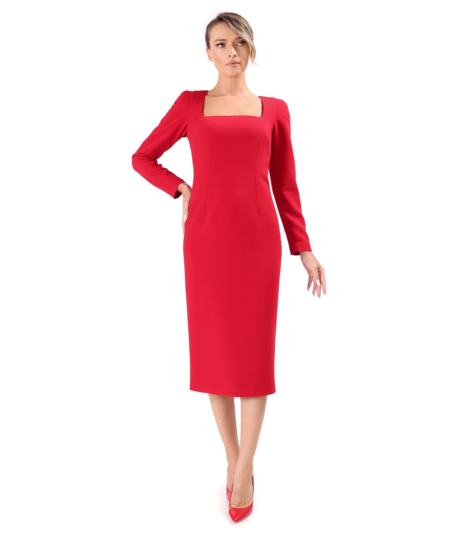 Midi dress made of elastic viscose fabric, lined, with long sleeves, square neckline and slit at the center back. It closes with a hidden zipper at the center back.