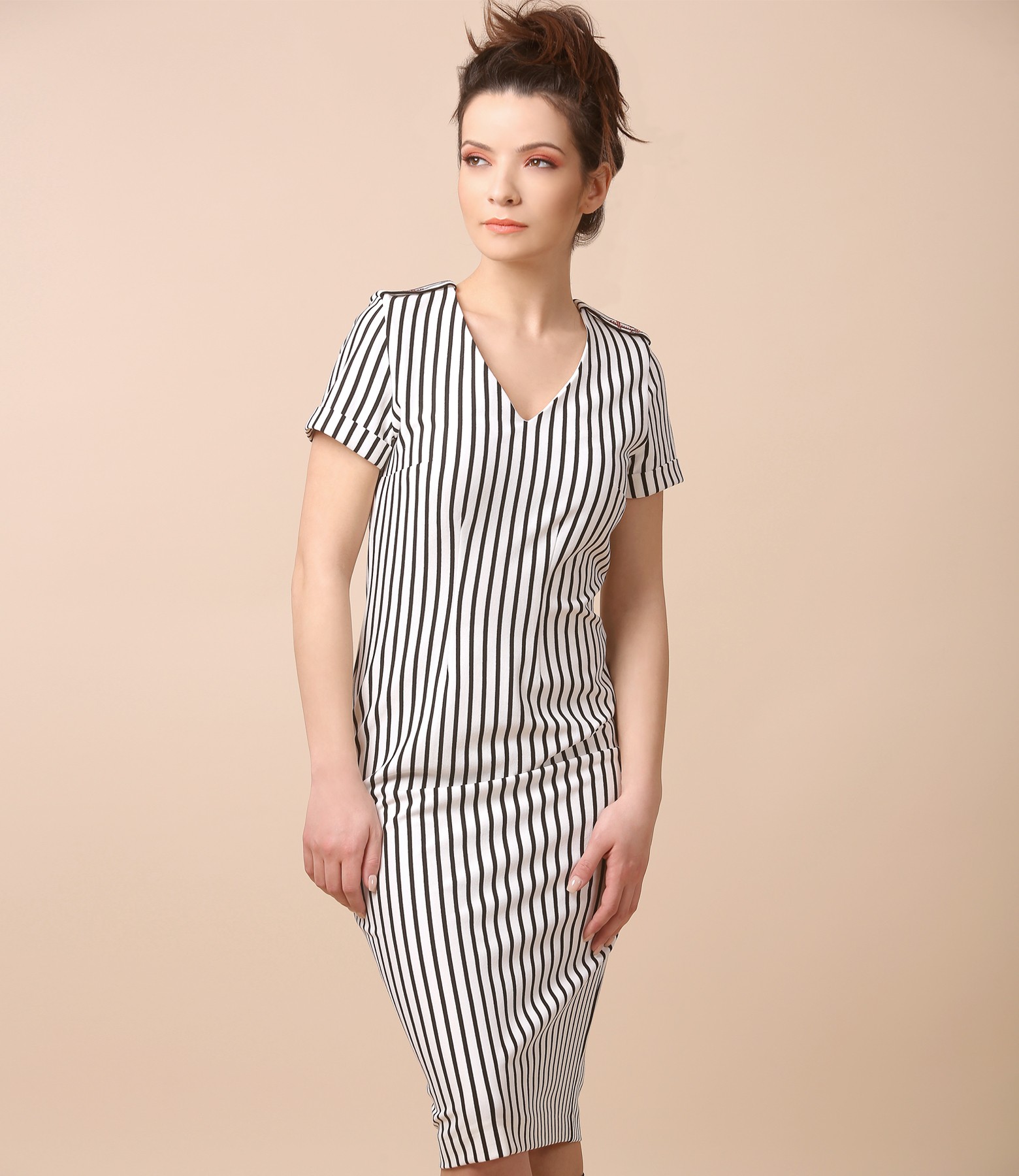 Midi dress made of elastic jersey printed with stripes, with short sleeves, V low-cut neck, anchor accessory on the epaulets. Closes with hidden zipper on the middle back.
