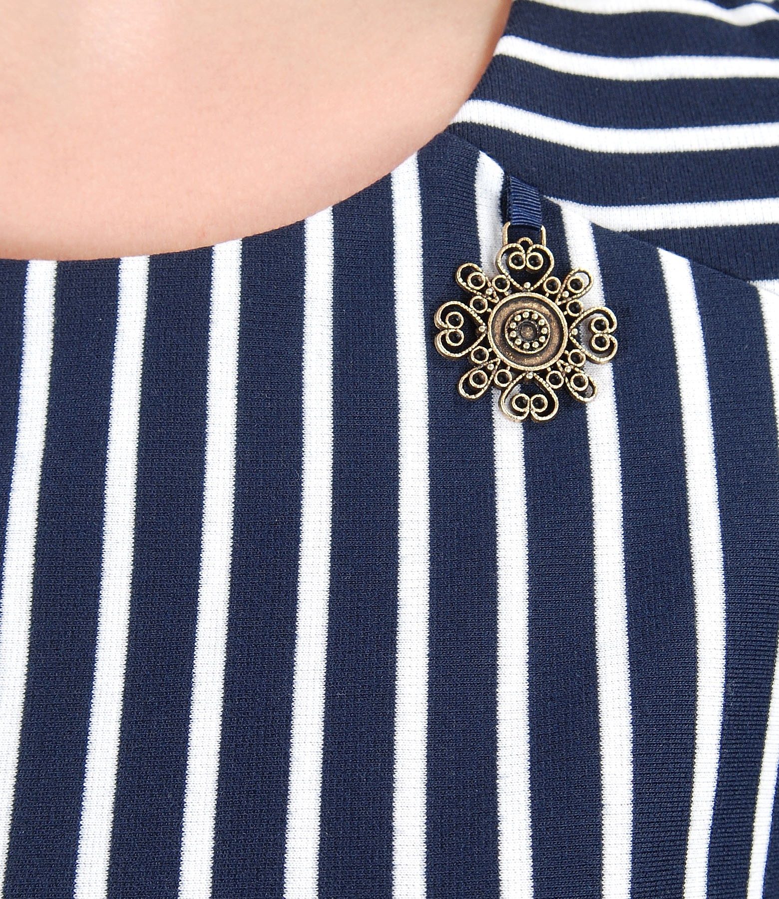 Midi dress made of elastic jersey printed with stripes, unlined, with short sleeves, round low-cut neck and metallic accessory on decolletage. Closes with hidden zipper on the middle back.