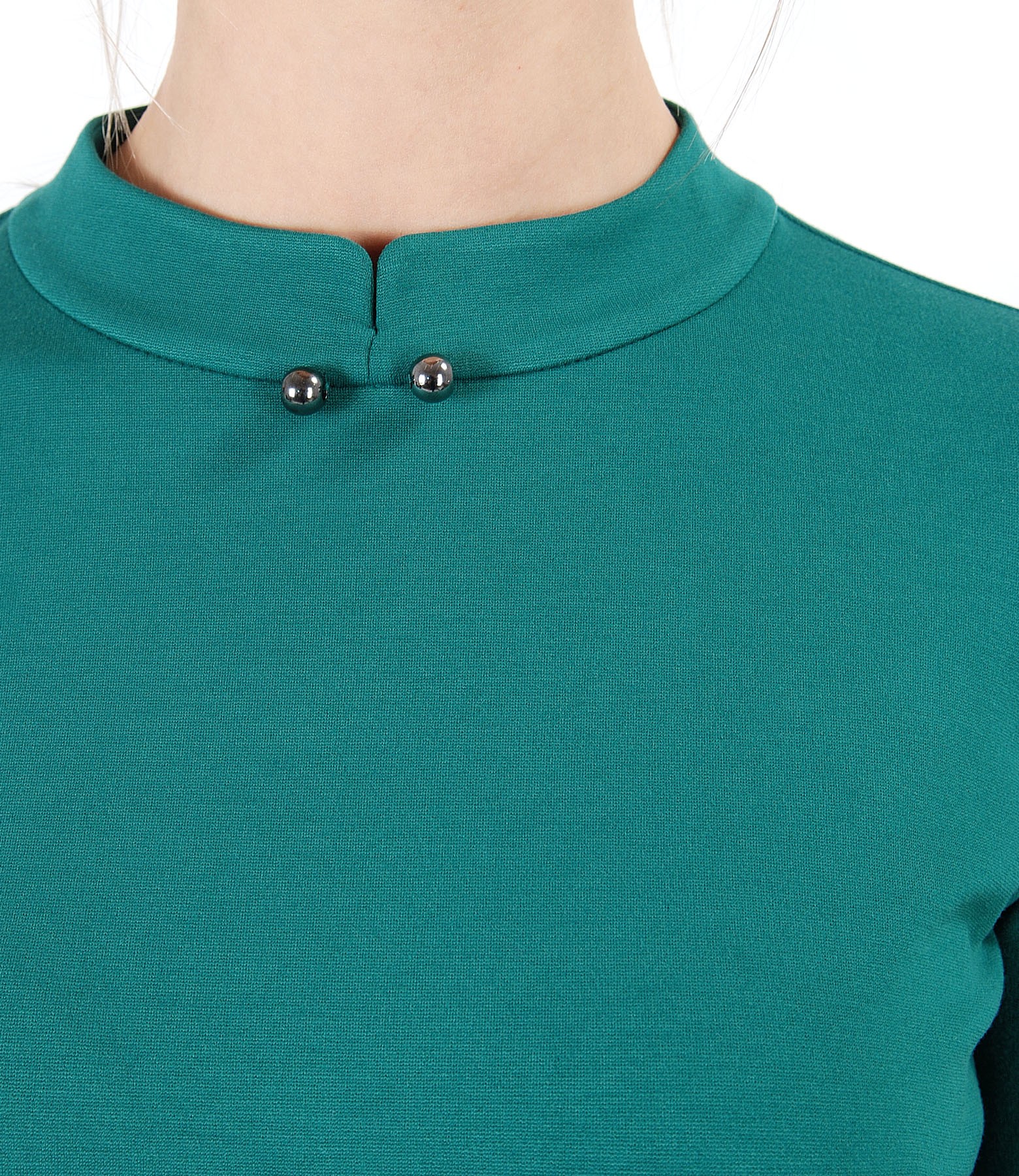 Elastic jersey dress, tunic collar, long sleeves and side pockets. Closes with a metallic zipper on the middle back.