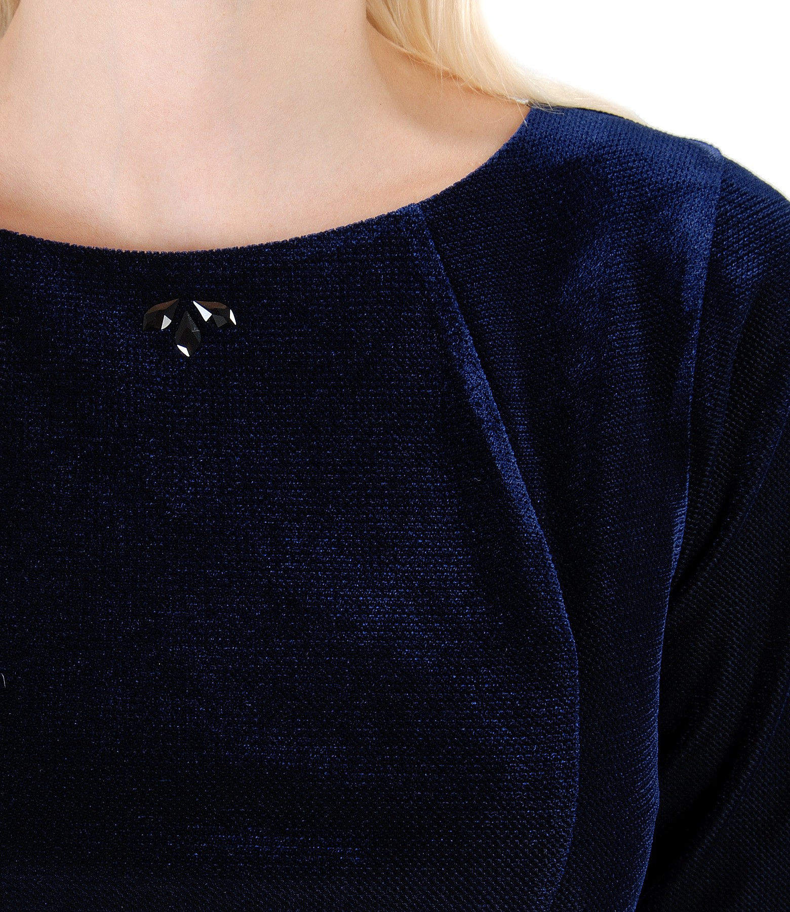 Midi dress made of elastic navy blue velvet, lined, with round decolletage embellished with crystalsto the decolletage and sleeves 3/4. Insertion made of the same fabric on the middle front. It closes with a hidden zipper on the middle back.