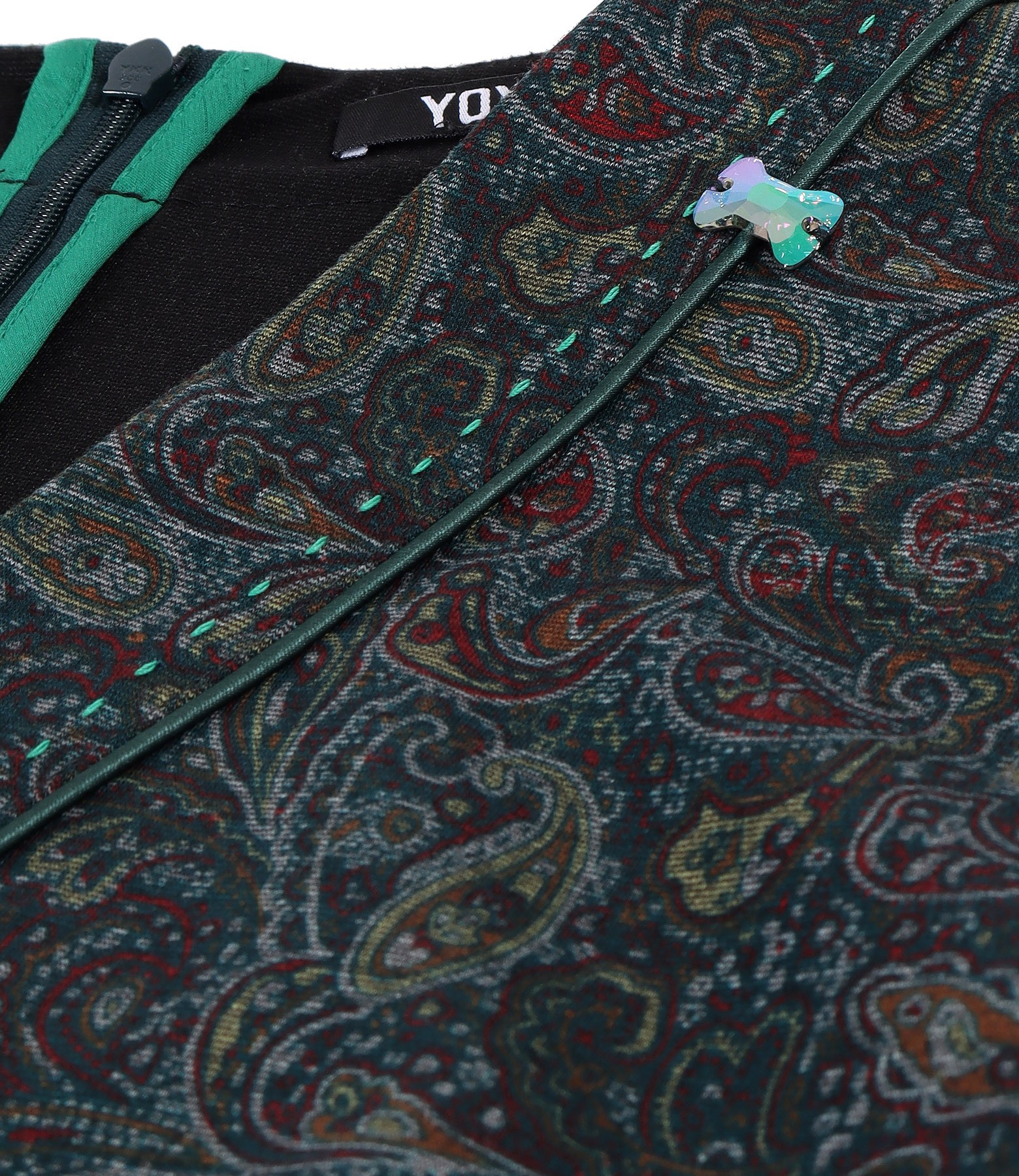 Midi dress made of paisley printed elastic jersey, with short sleeves, low-cut neck embellished with crystals. Closes with a hidden zipper on the middle back.