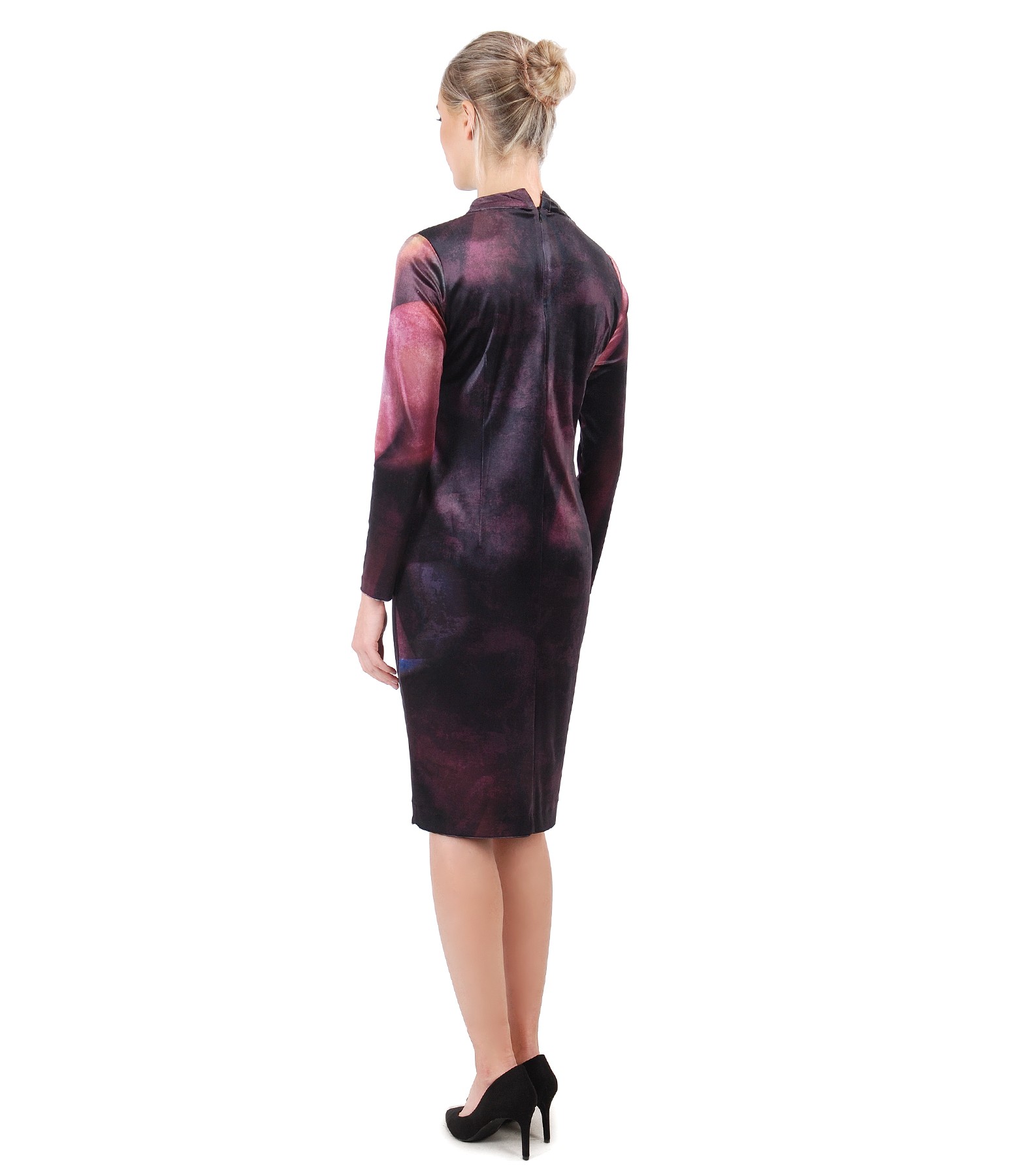Midi dress made of printed velvet, padded, with tunic collar, long sleeves.