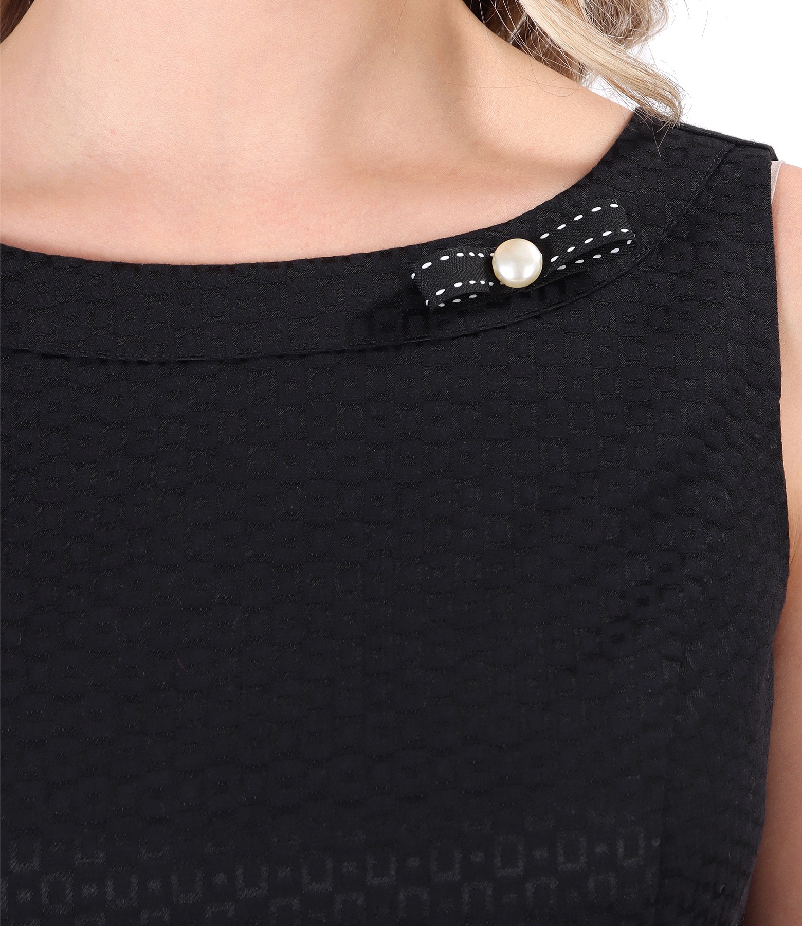 Midi dress made of textured elastic cotton.without sleeves,unlined,V-neckline on the back and bow rips embellished with pearls fixed on the decolletage.It closes with a hidden zipper on the middle back.