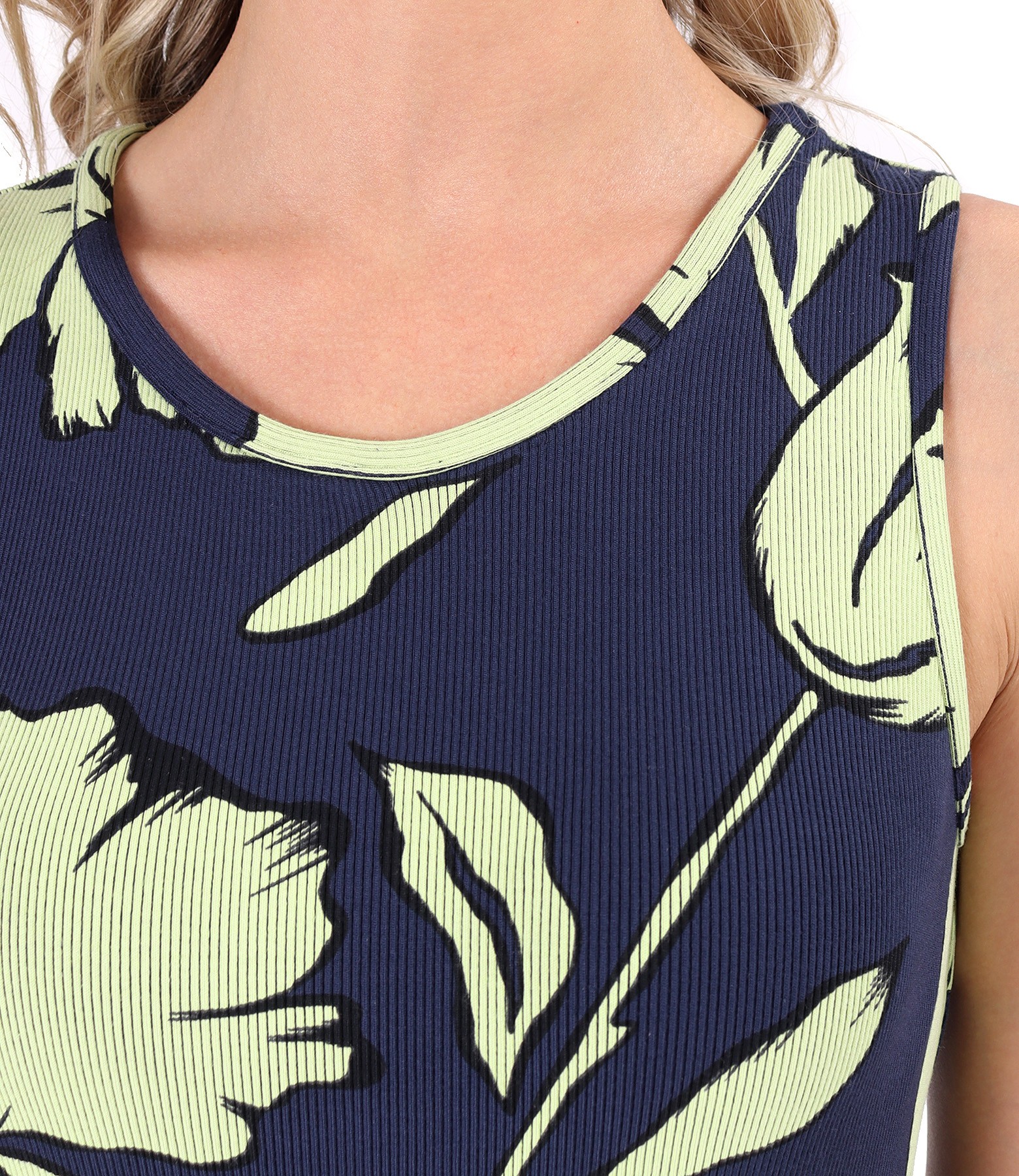 Elastic jersey midi dress (with pattern) digitally printed with oversized floral motifs, sleeveless and round neckline, ideal for summer evenings.