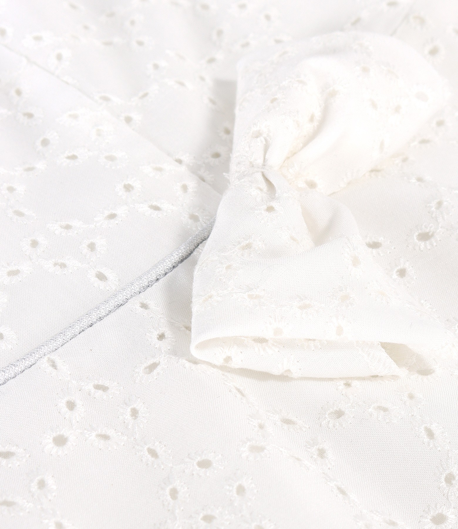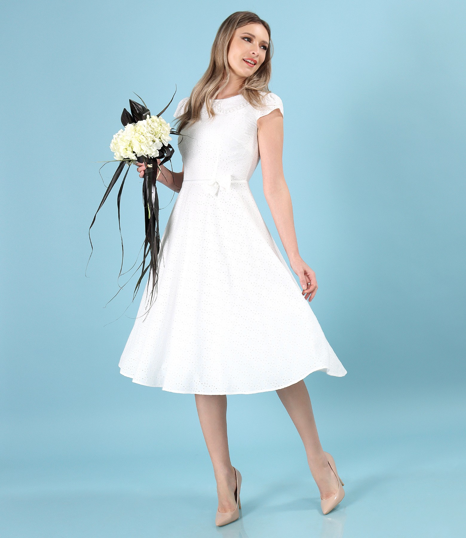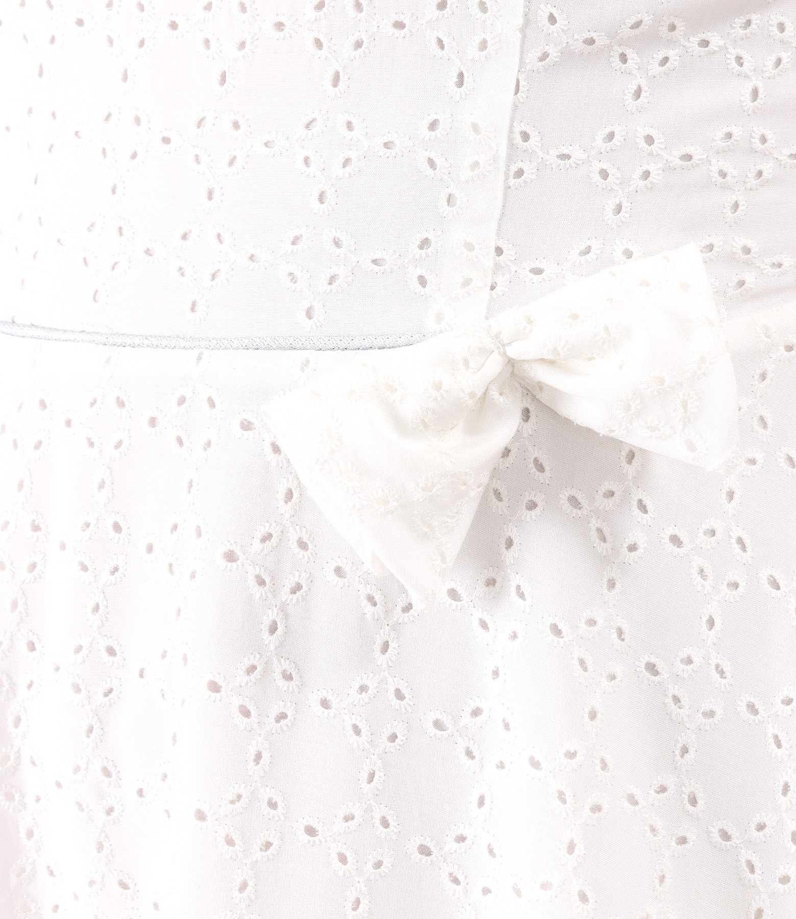 Midi dress made of viscose embroidery, padded with viscose and tulle at the bottom, with short wing-type sleeves, round neckline with sequins, and bow at the waist. It closes with a hidden zipper on the middle back.