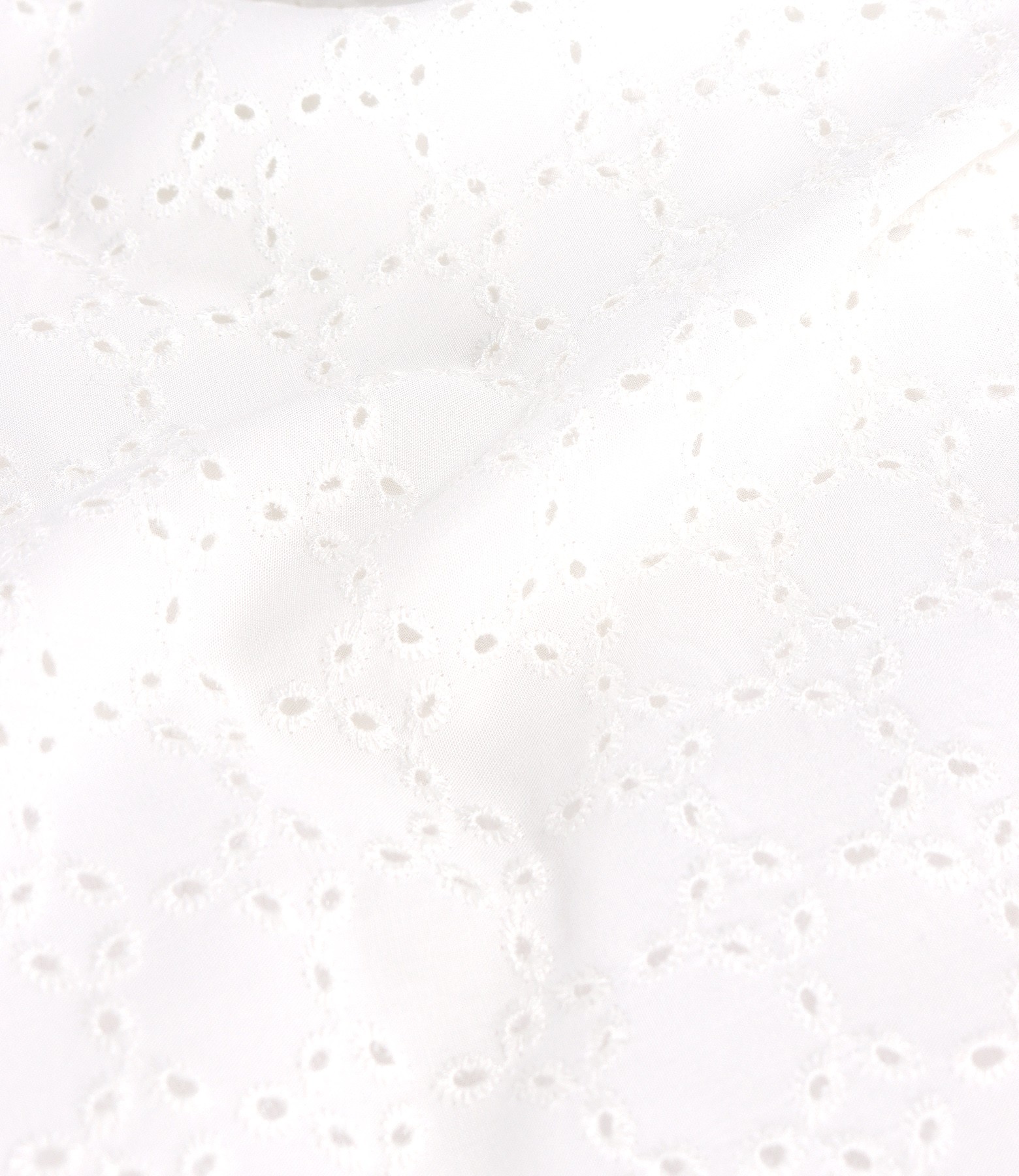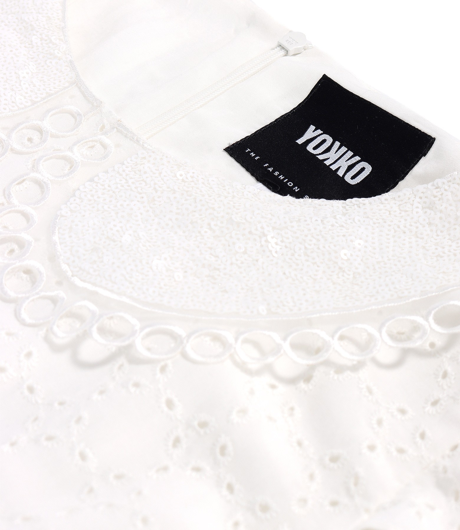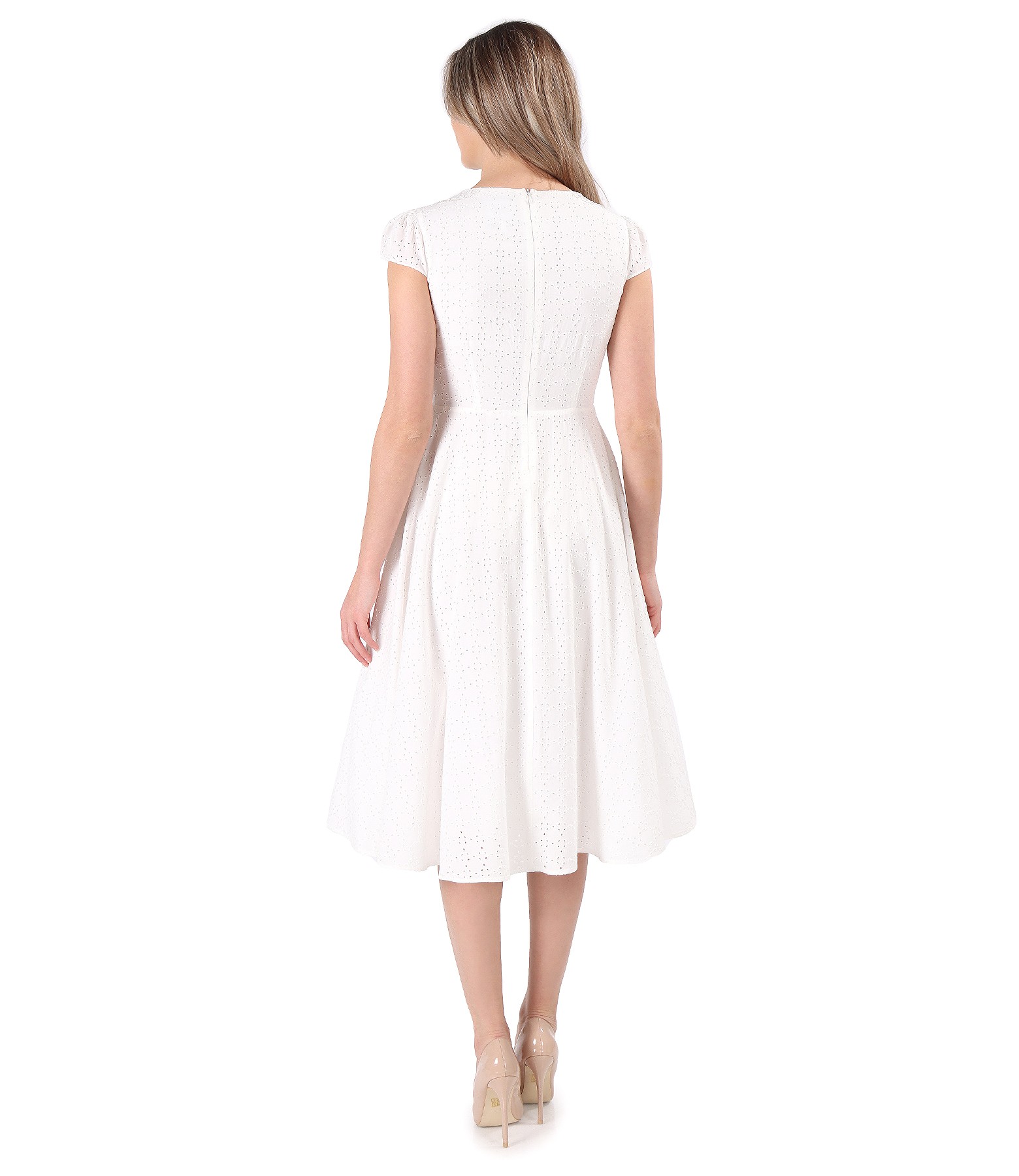 Midi dress made of viscose embroidery, padded with viscose and tulle at the bottom, with short wing-type sleeves, round neckline with sequins, and bow at the waist. It closes with a hidden zipper on the middle back.