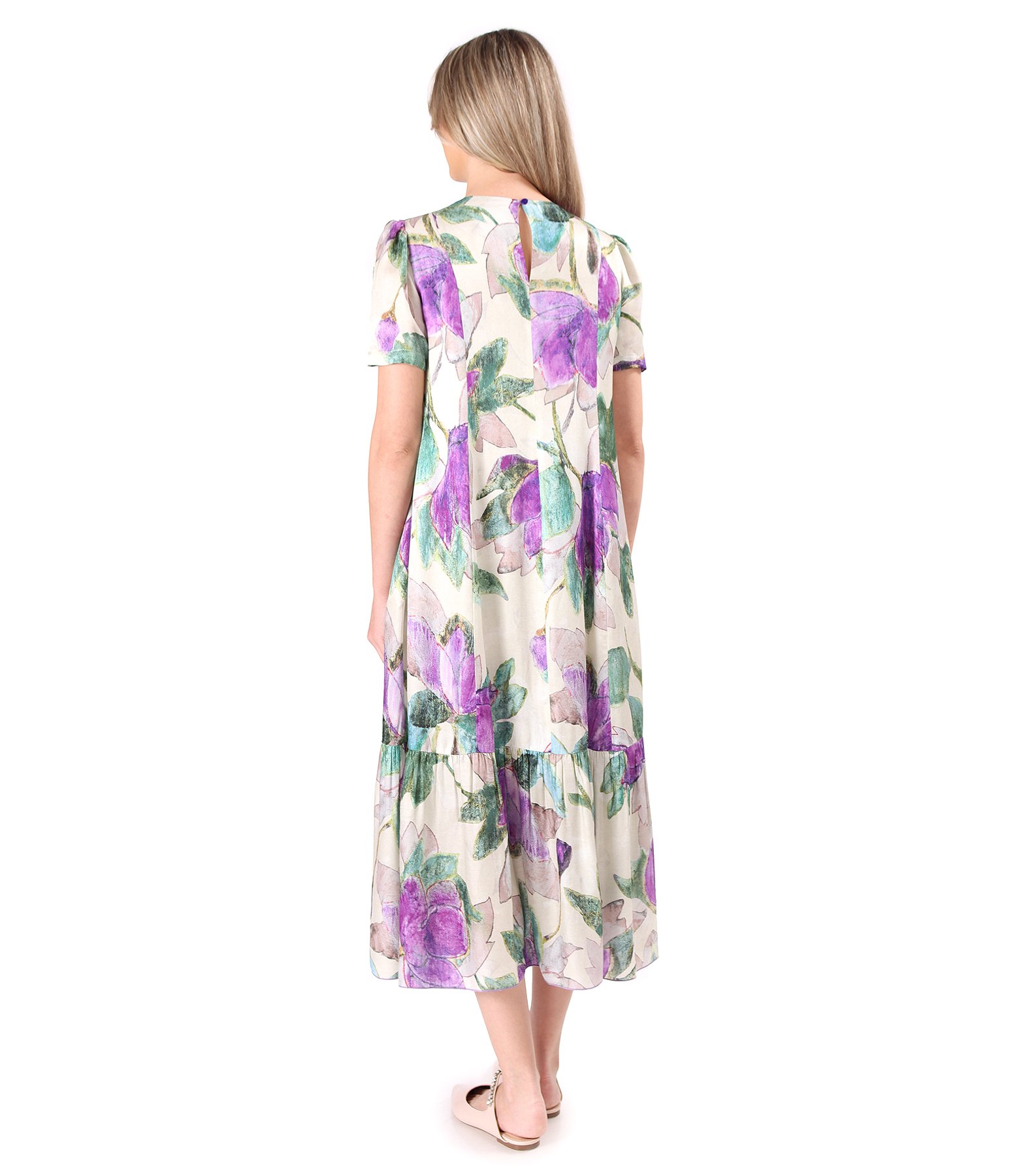 Loose midi dress made of viscose with natural silk, printed with floral motifs, with a frill at the end, a round neckline, and side pockets. It closes with a button at the center back. The position of the print varies per product.