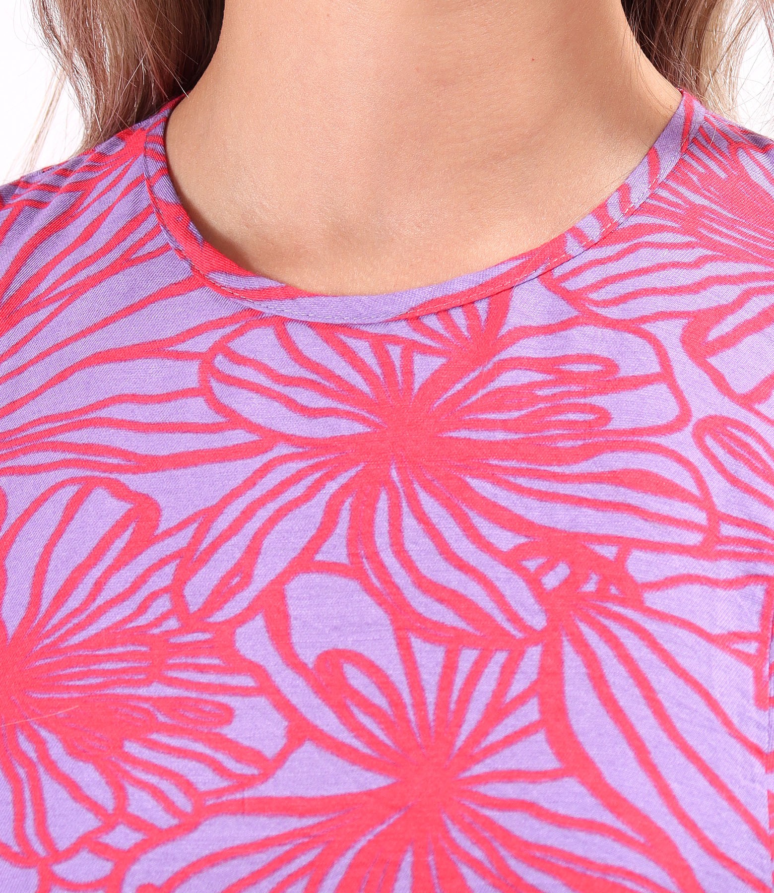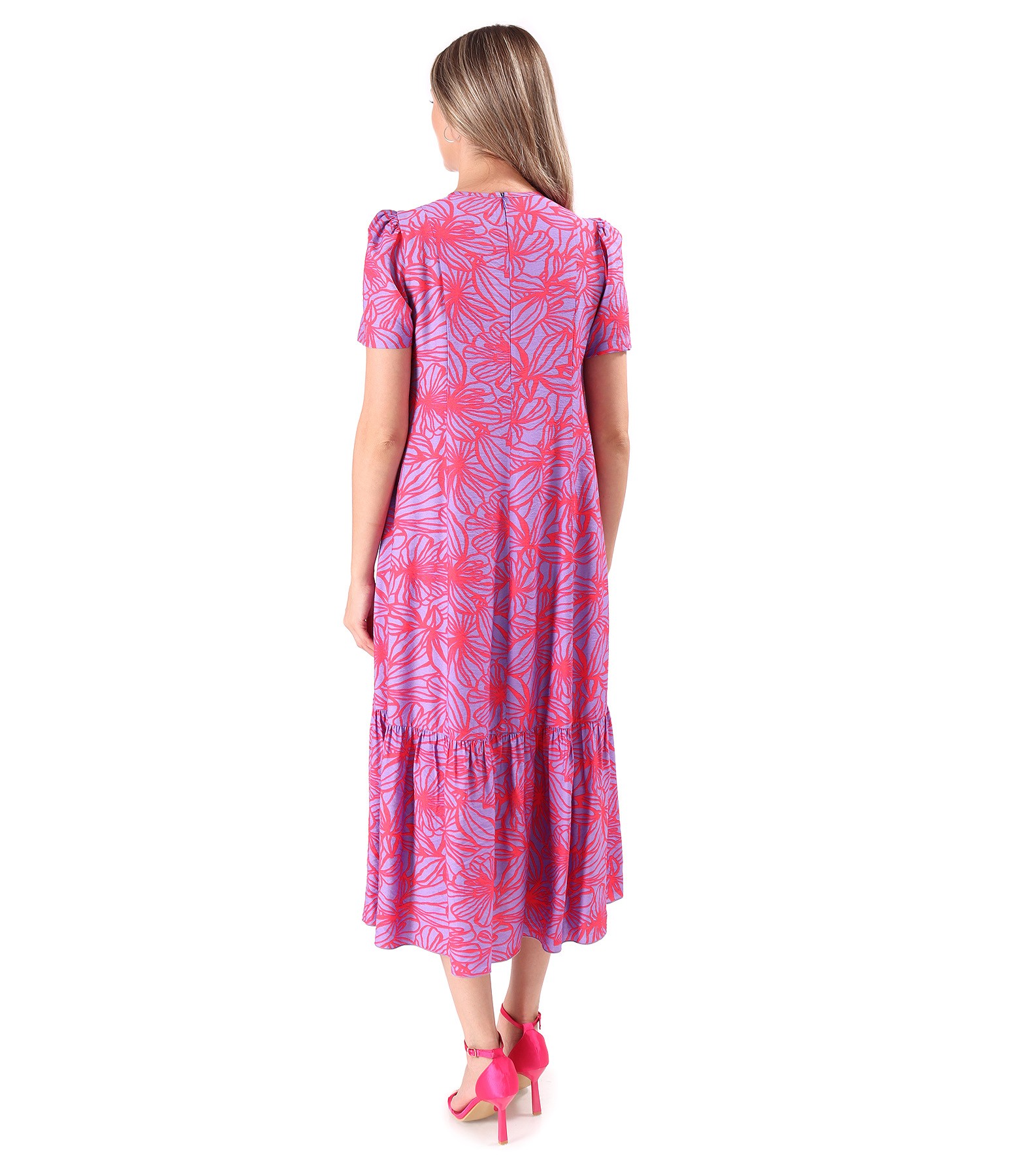 Midi dress printed with floral motifs, a ruffle at the end, a round neckline, and side pockets. It closes with a hidden zipper at the center back. The position of the print varies per product.