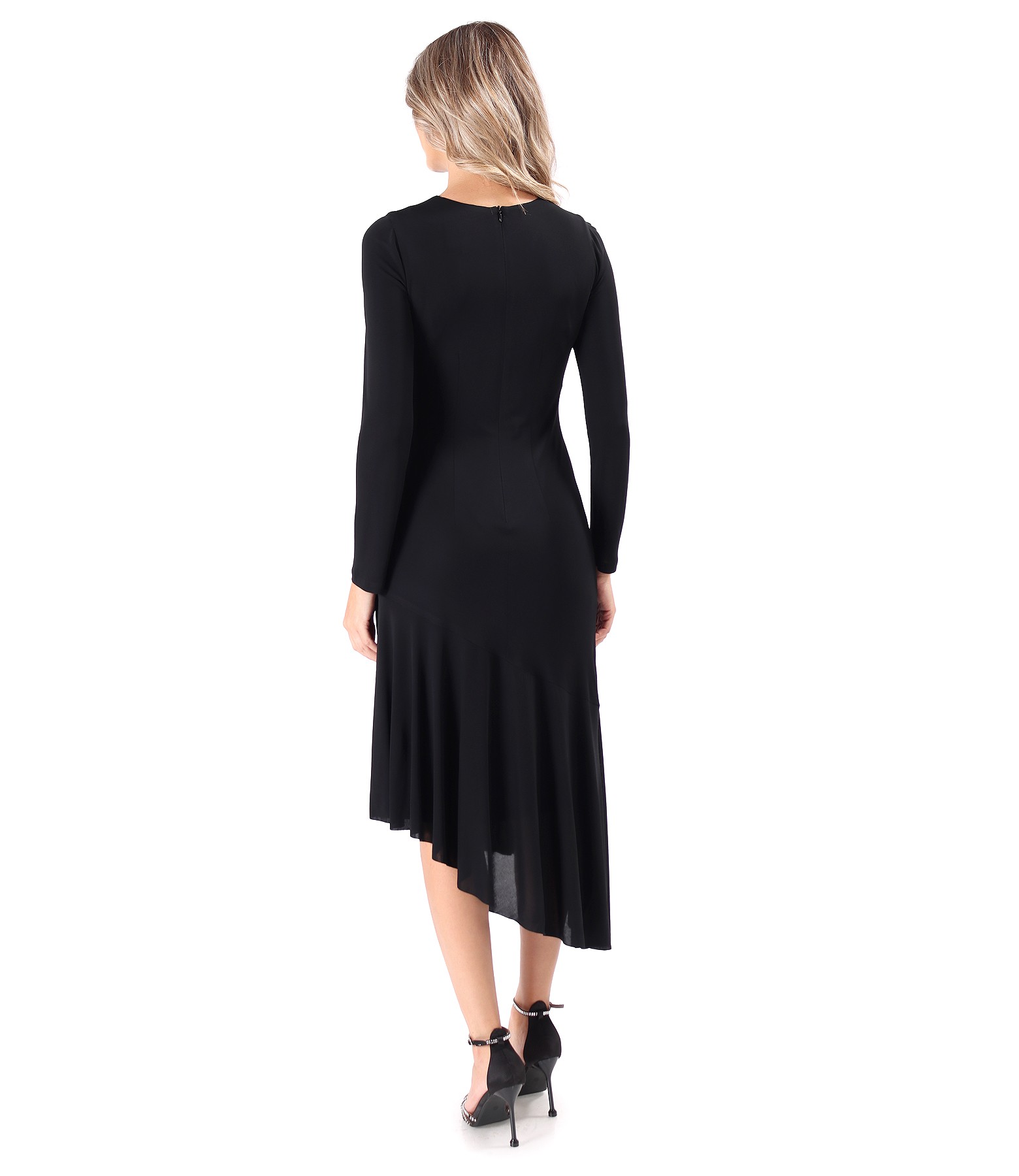 Midi dress with an asymmetrical frill made of viscose, with long sleeves, round neckline, and slit on the front on the left side. Closes with a zipper on the middle of the back.