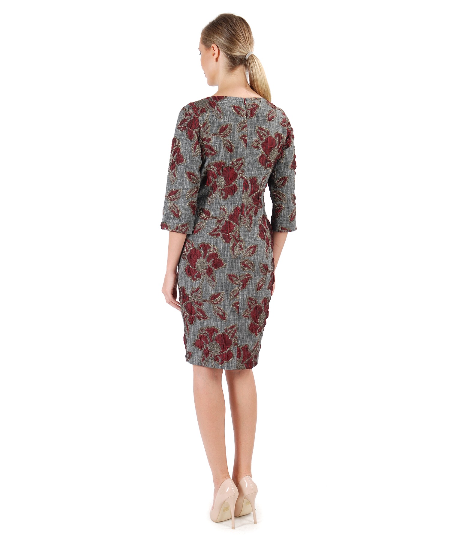 Midi dress, brocade with flowers and golden metallic thread, 3/4 sleeves and round low-cut neck. Closes with hidden zipper on the middle back.