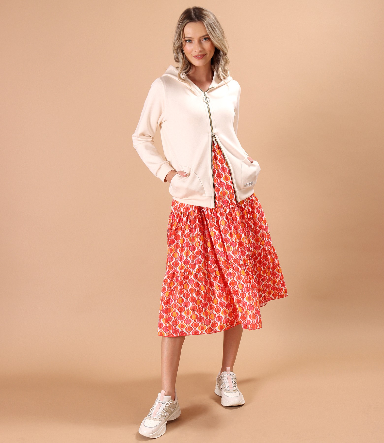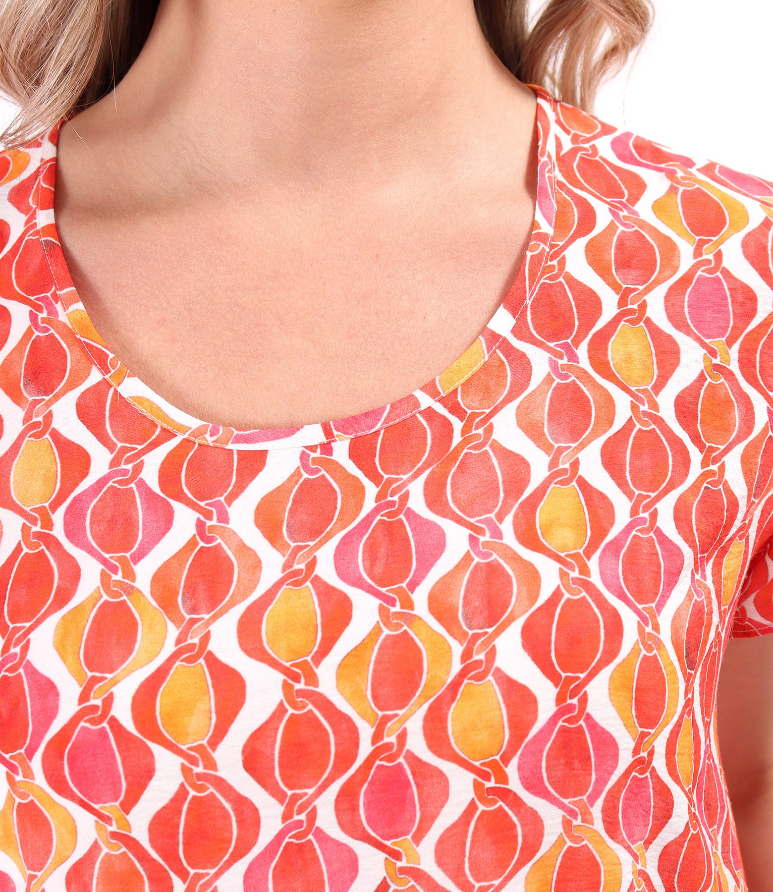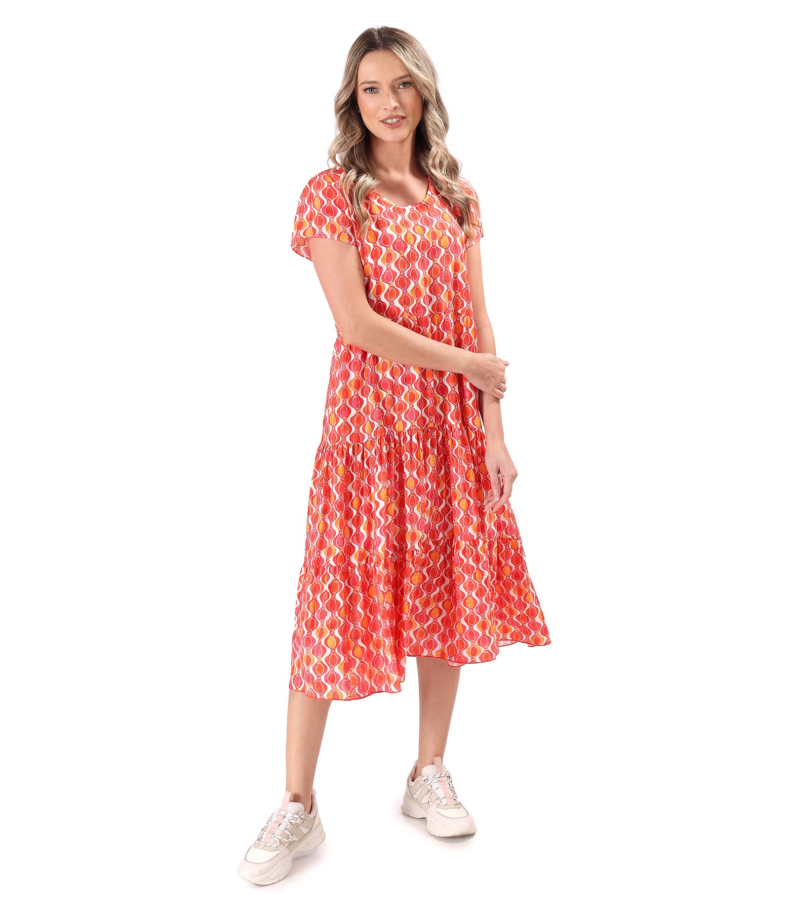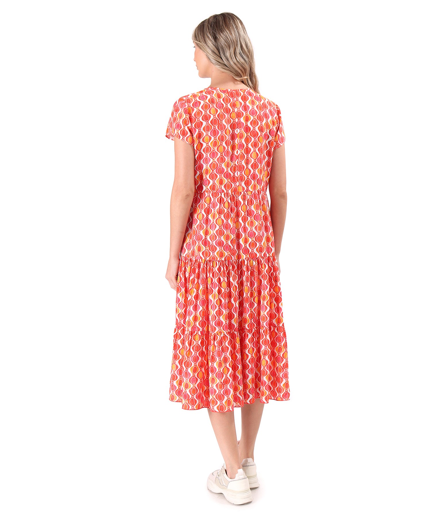 Midi dress with ruffles in viscose printed with geometric motifs (Coral red), size