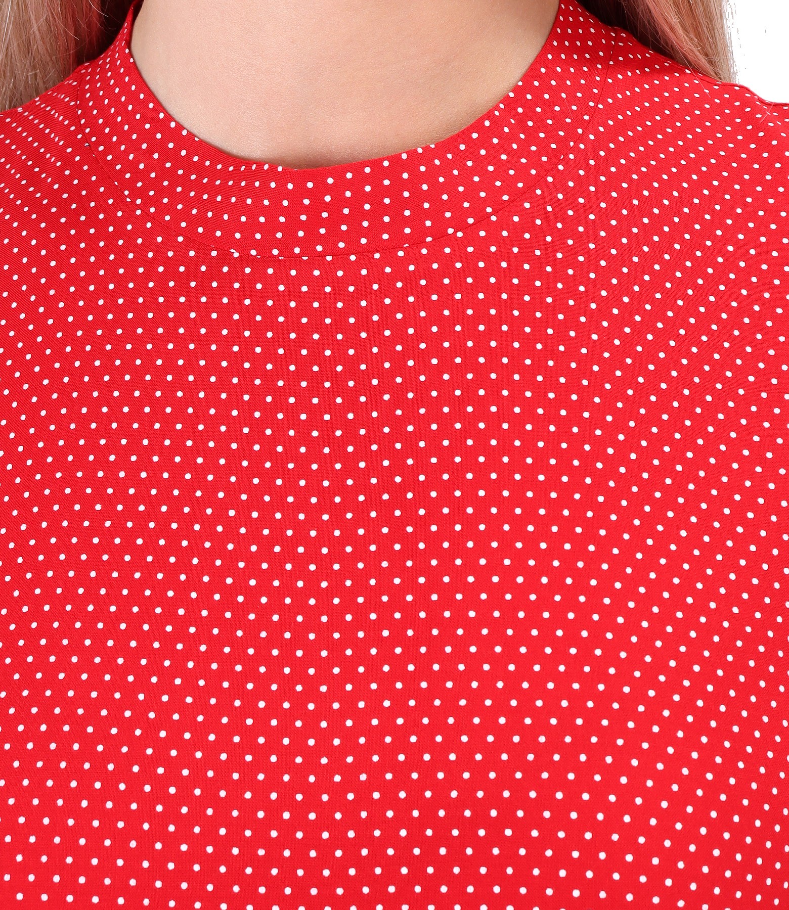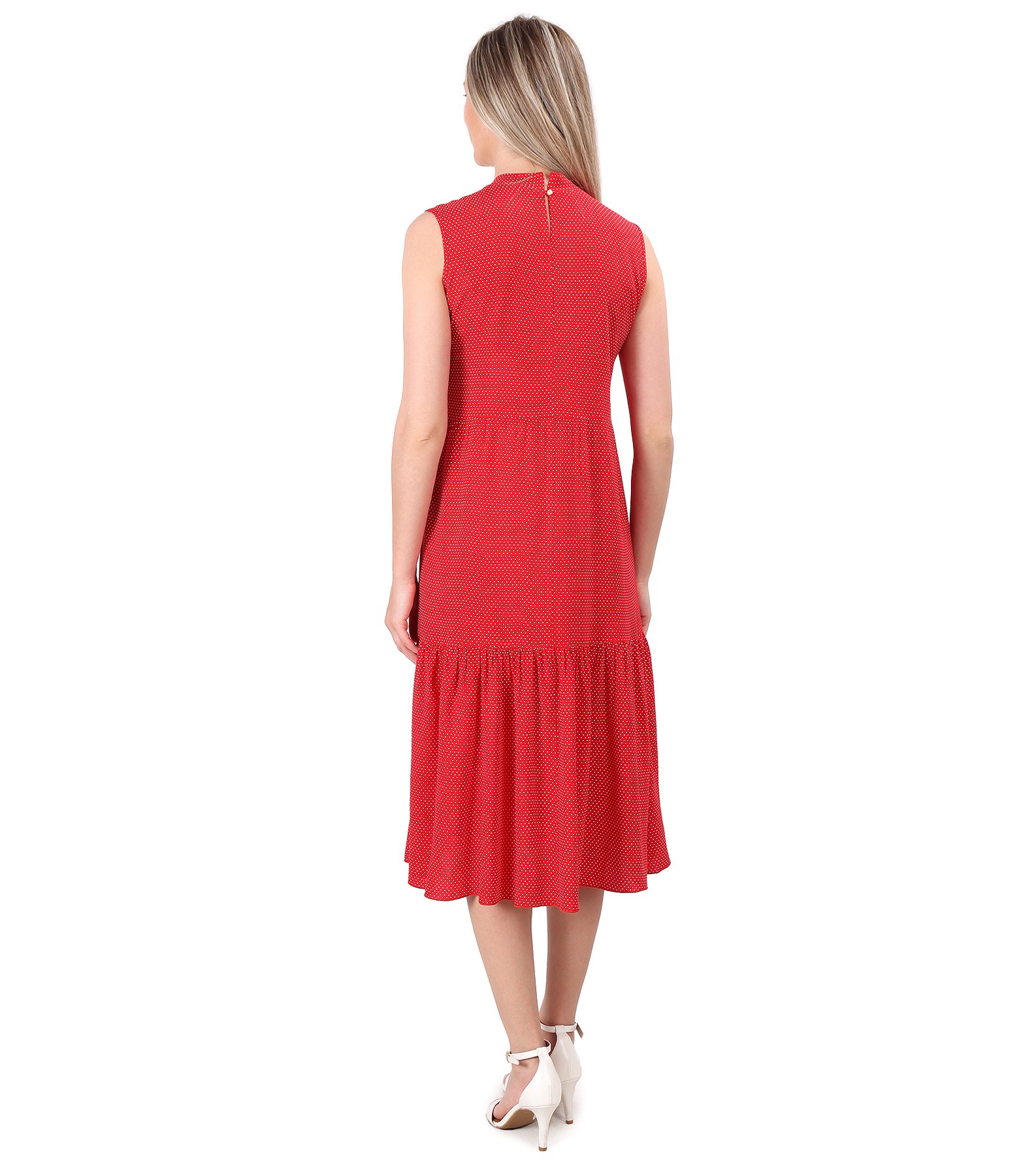 Midi dress with ruffles made of viscose printed with dots, unlined, sleeveless, and with a round collar around the neck. It closes with a button on the middle back.