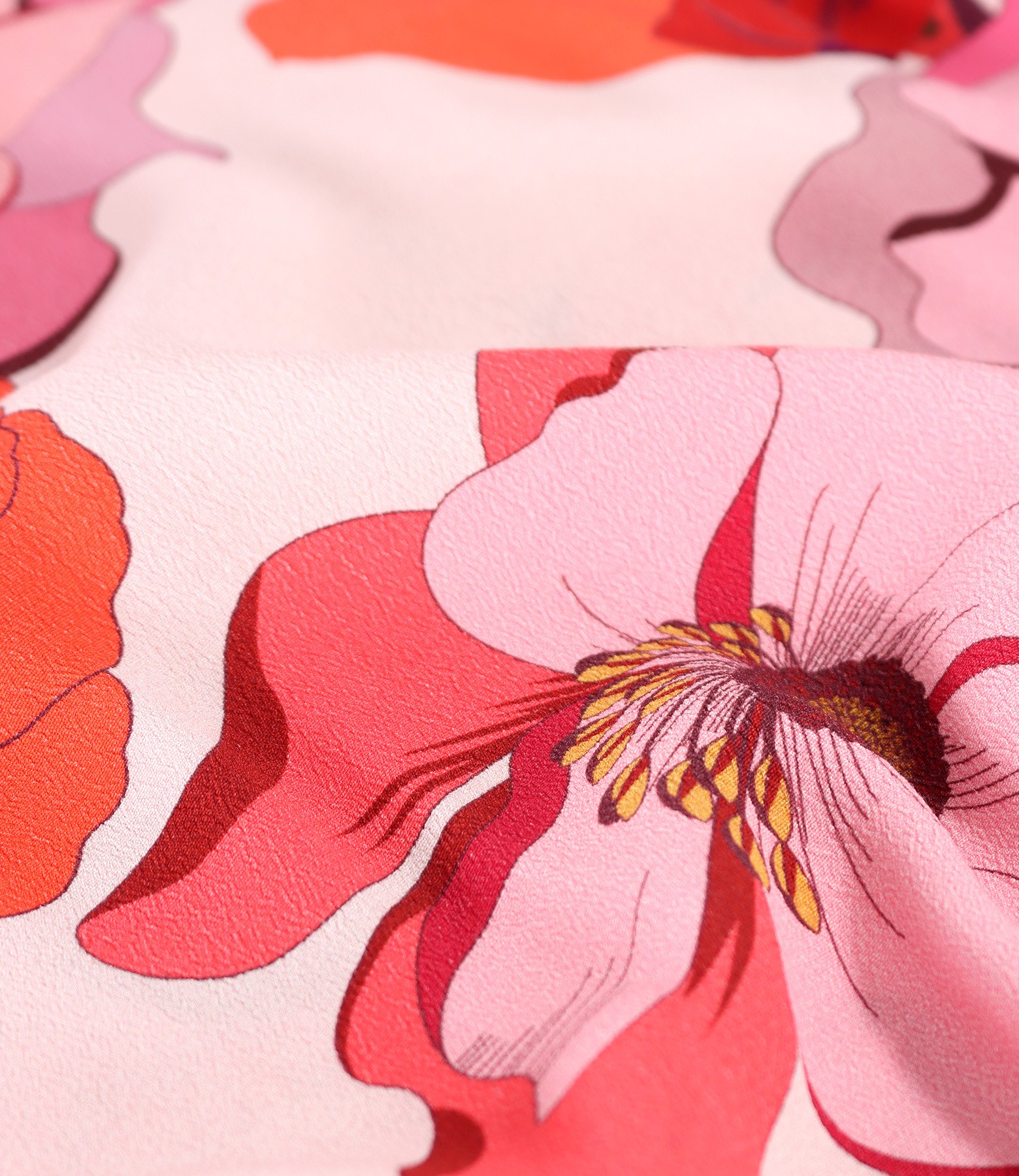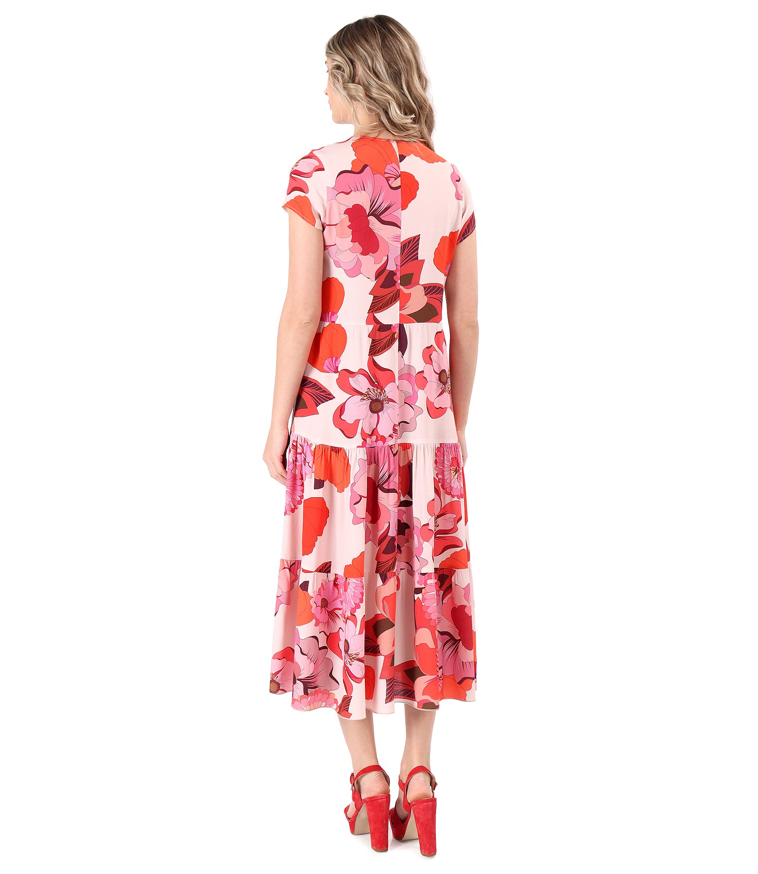 Midi dress with printed viscose ruffles with oversized floral motifs, unlined, with short sleeves and V-neckline. It has no closure system. The print pattern varies by product.