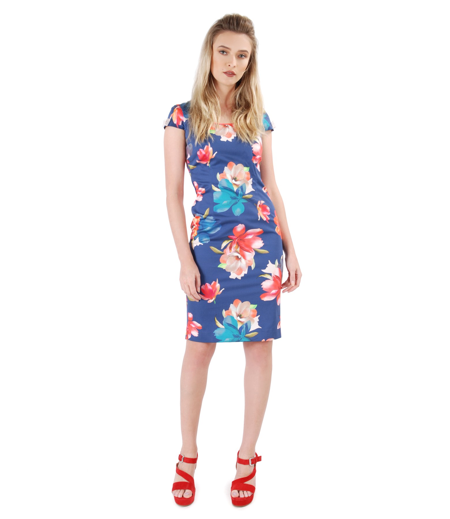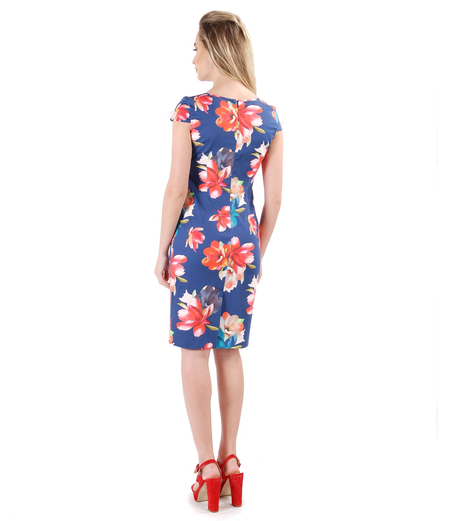 Midi elastic cotton dress with floral print, unlined, with round low-cut neck, short sleeves, organza bow on the sleeves. Closes with hidden zipper on the middle back.