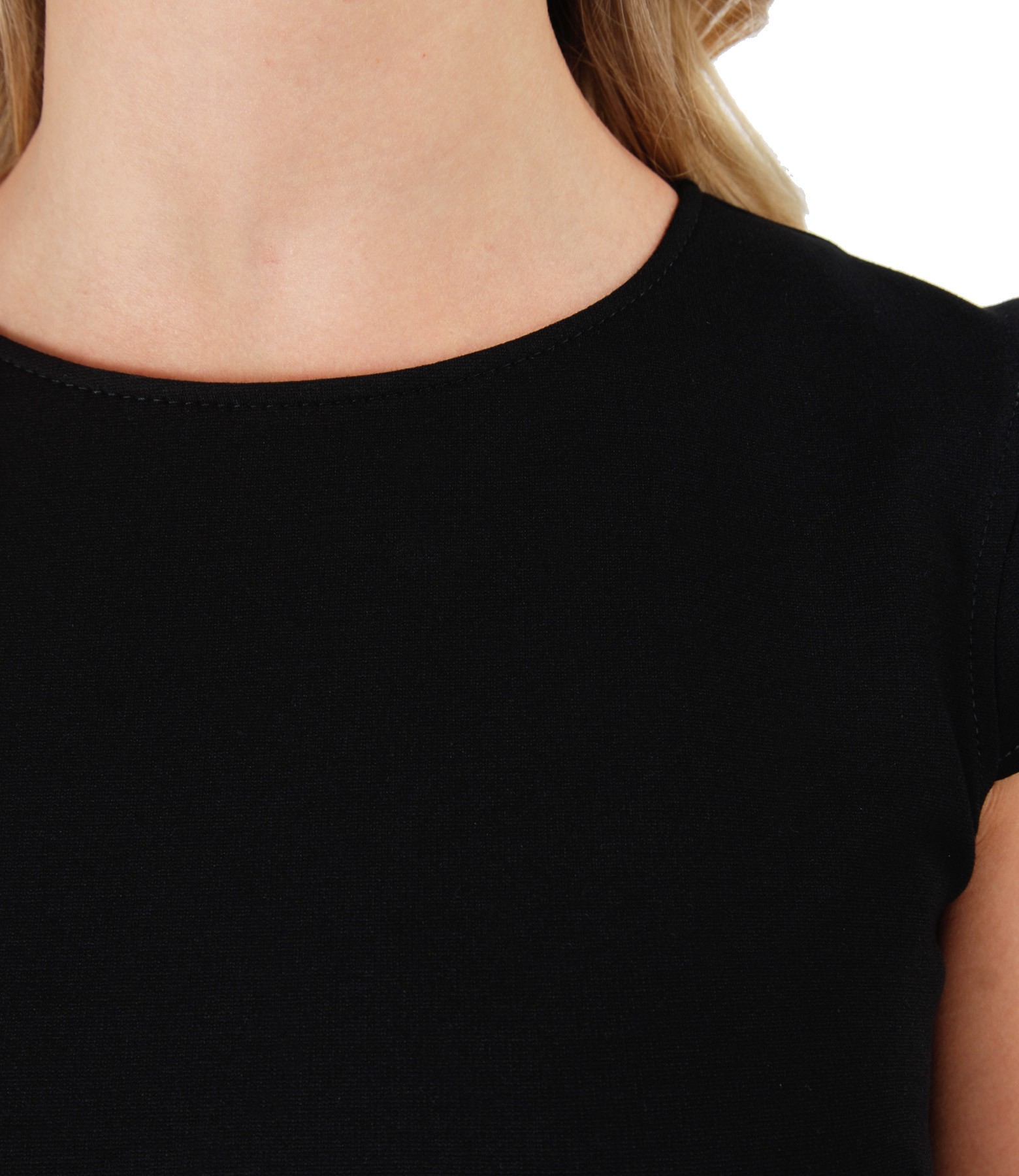 Midi elastic jersey dress, unlined, with round low-cut neck, short sleeves. Closes with hidden zipper on the middle back.