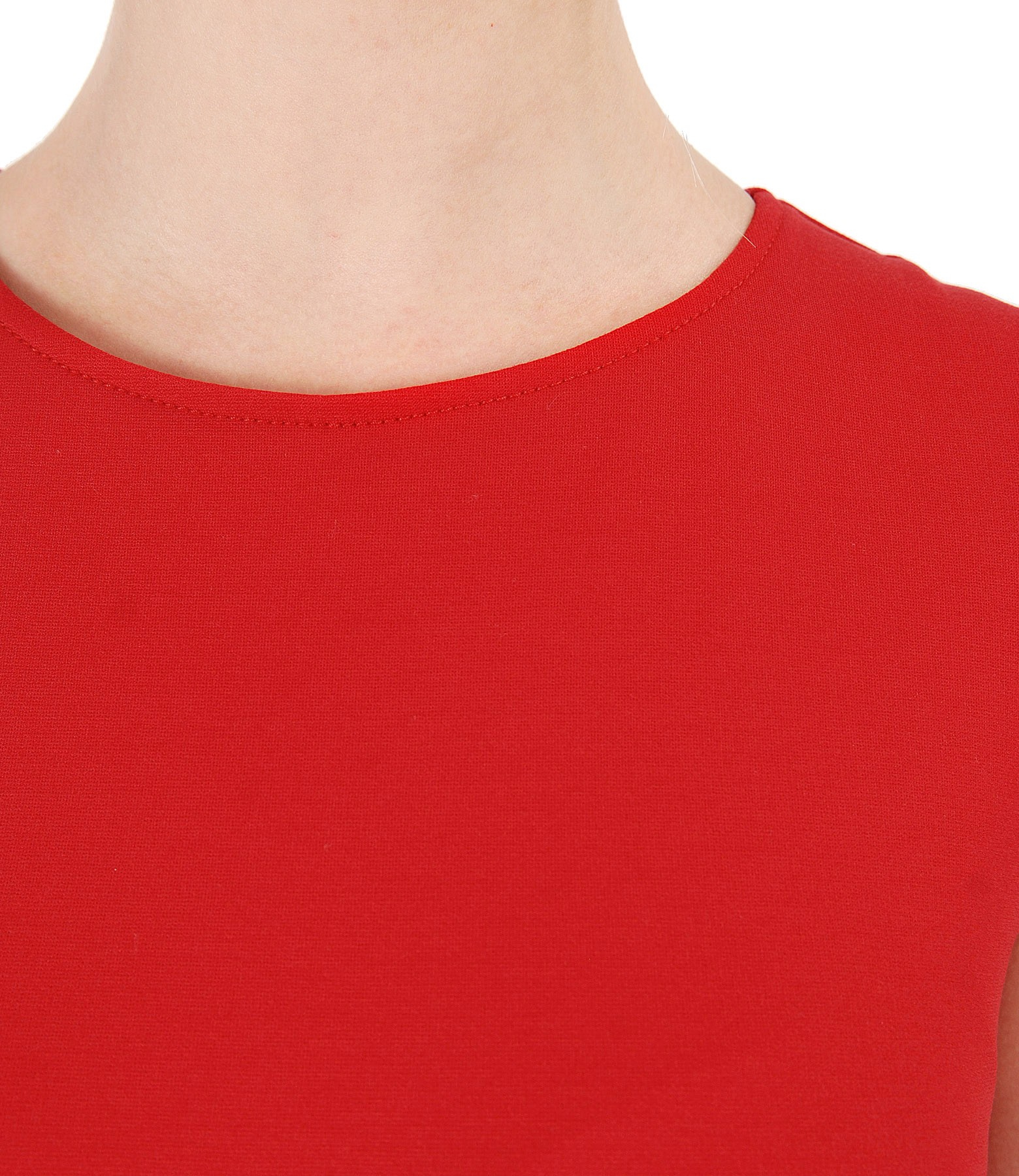 Midi elastic jersey dress, unlined, with round low-cut neck, short sleeves. Closes with hidden zipper on the middle back.