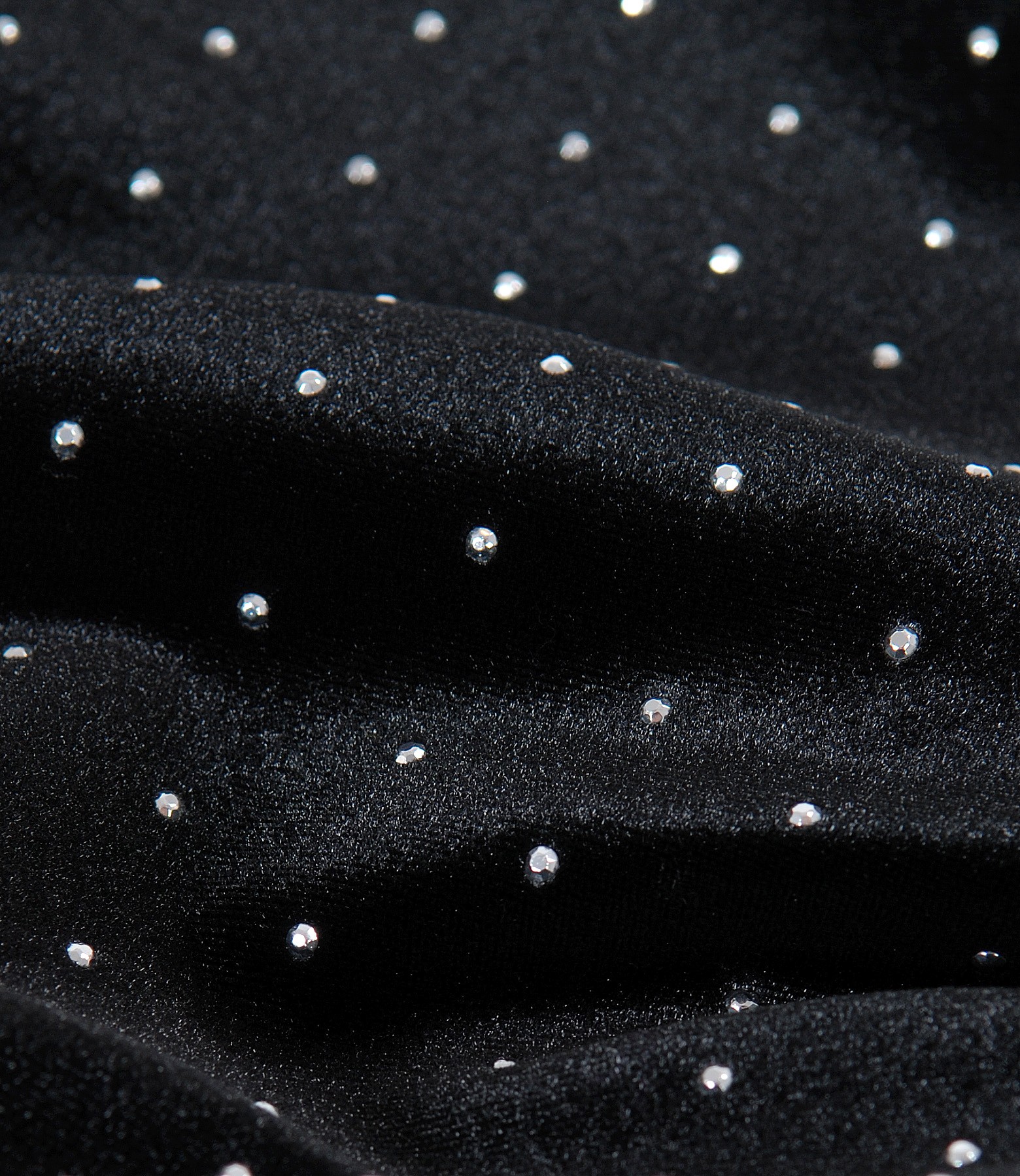 Black elastic velvet dress, padded, with round low-cut neck, with short sleeves, and metallic inserts on the front. Closes with hidden zipper on the middle back.