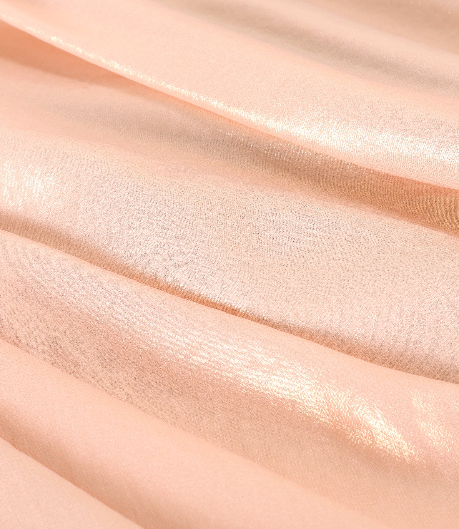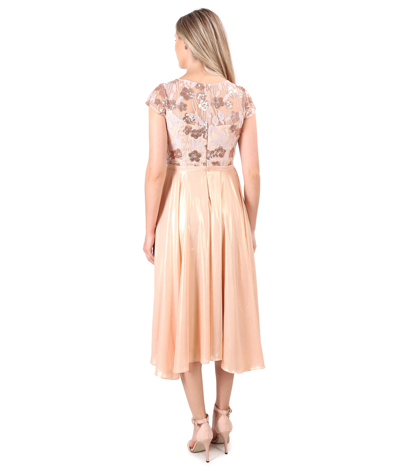 Midi evening dress, with pearlescent veil skirt, doubled with elastic satin, with lace bodice with sequins. It is tightened at the waist with a cord. It closes with a zipper hidden in the middle of the back.