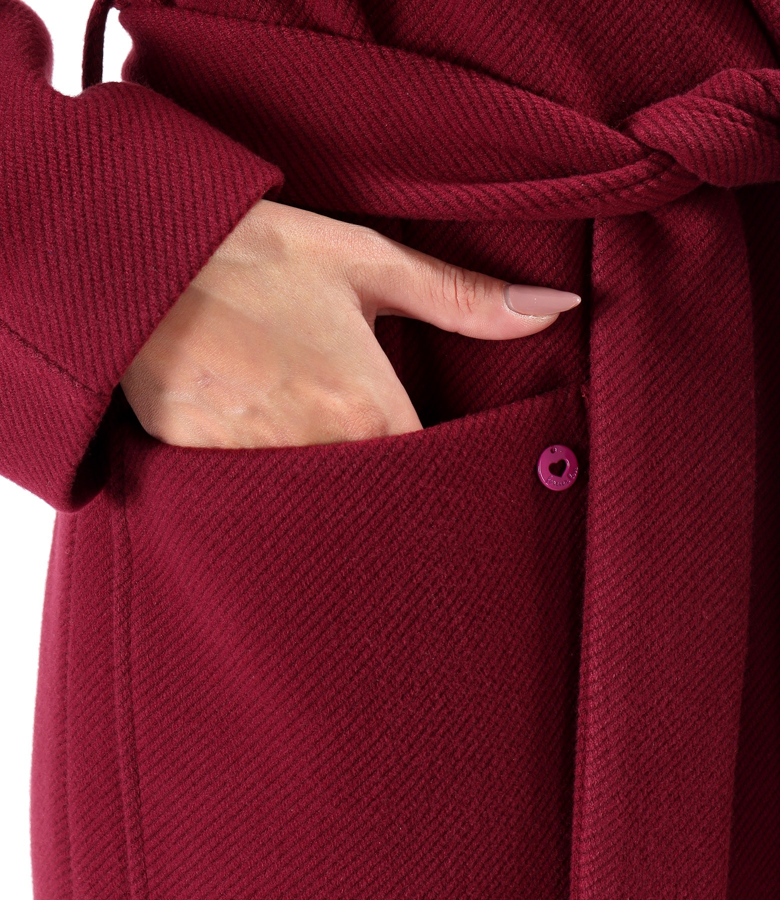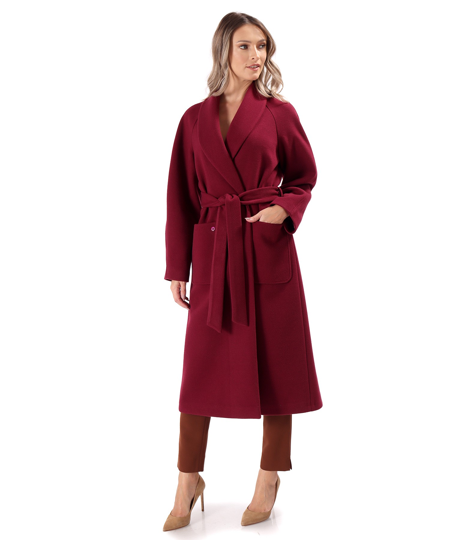 Midi overcoat made of thick fabric, padded with viscose, with pockets applied on the front, long raglan sleeves, and a slit on the middle back. It closes with a cord fixed to the side.