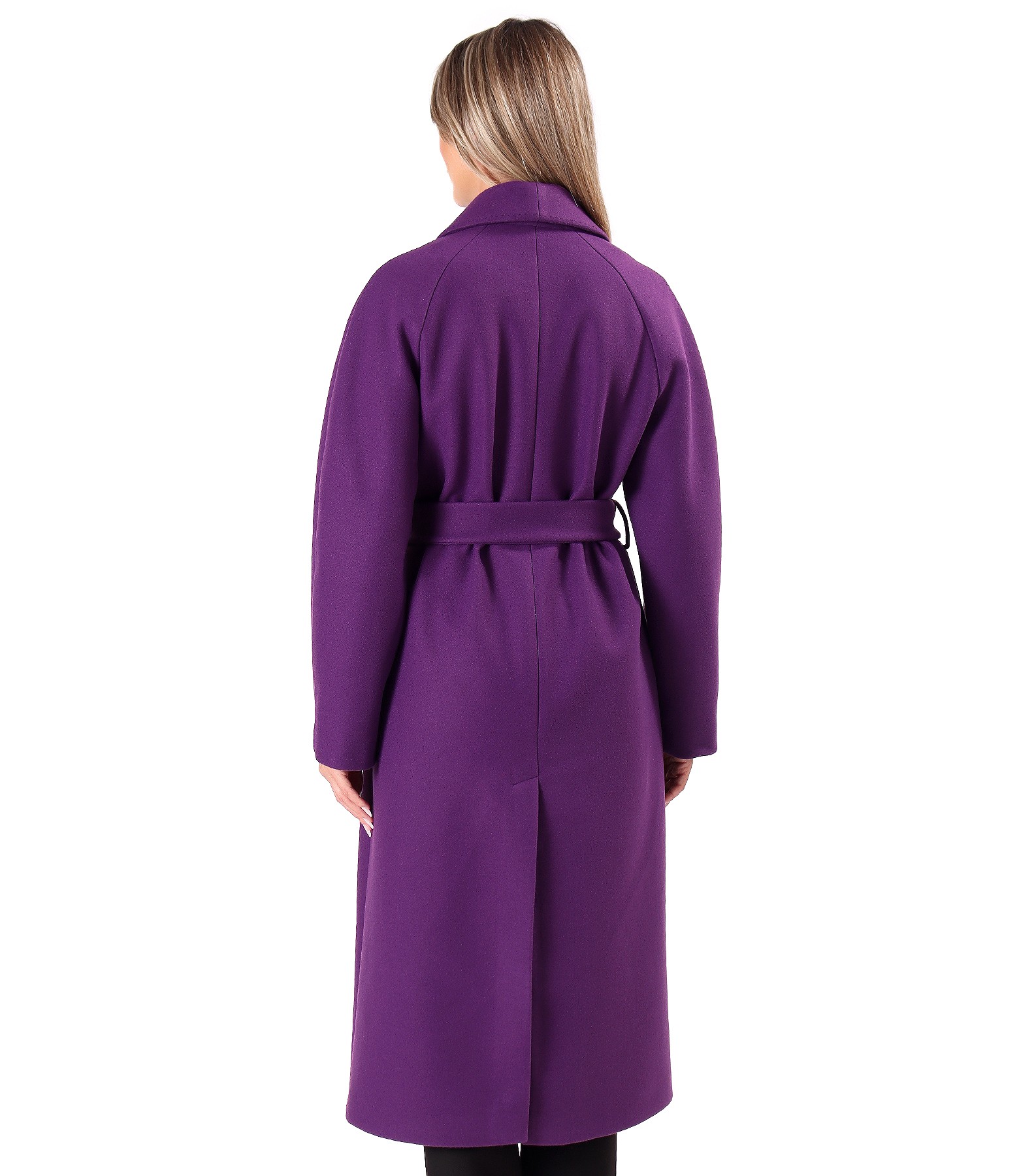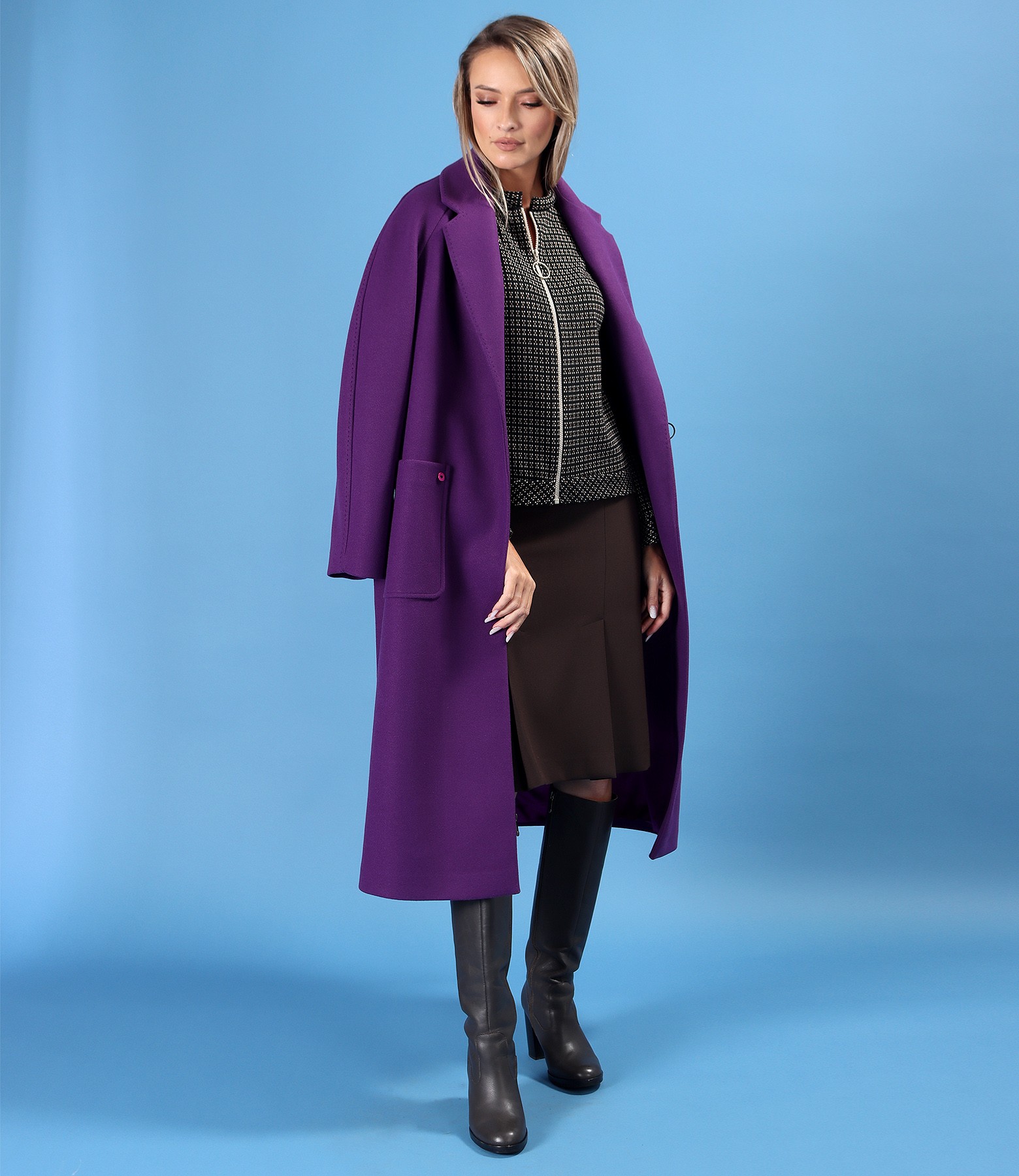 Midi overcoat made of thick fabric, padded with viscose, with pockets applied on the front, long raglan sleeves, and a slit on the middle back. It closes with a cord fixed to the side.