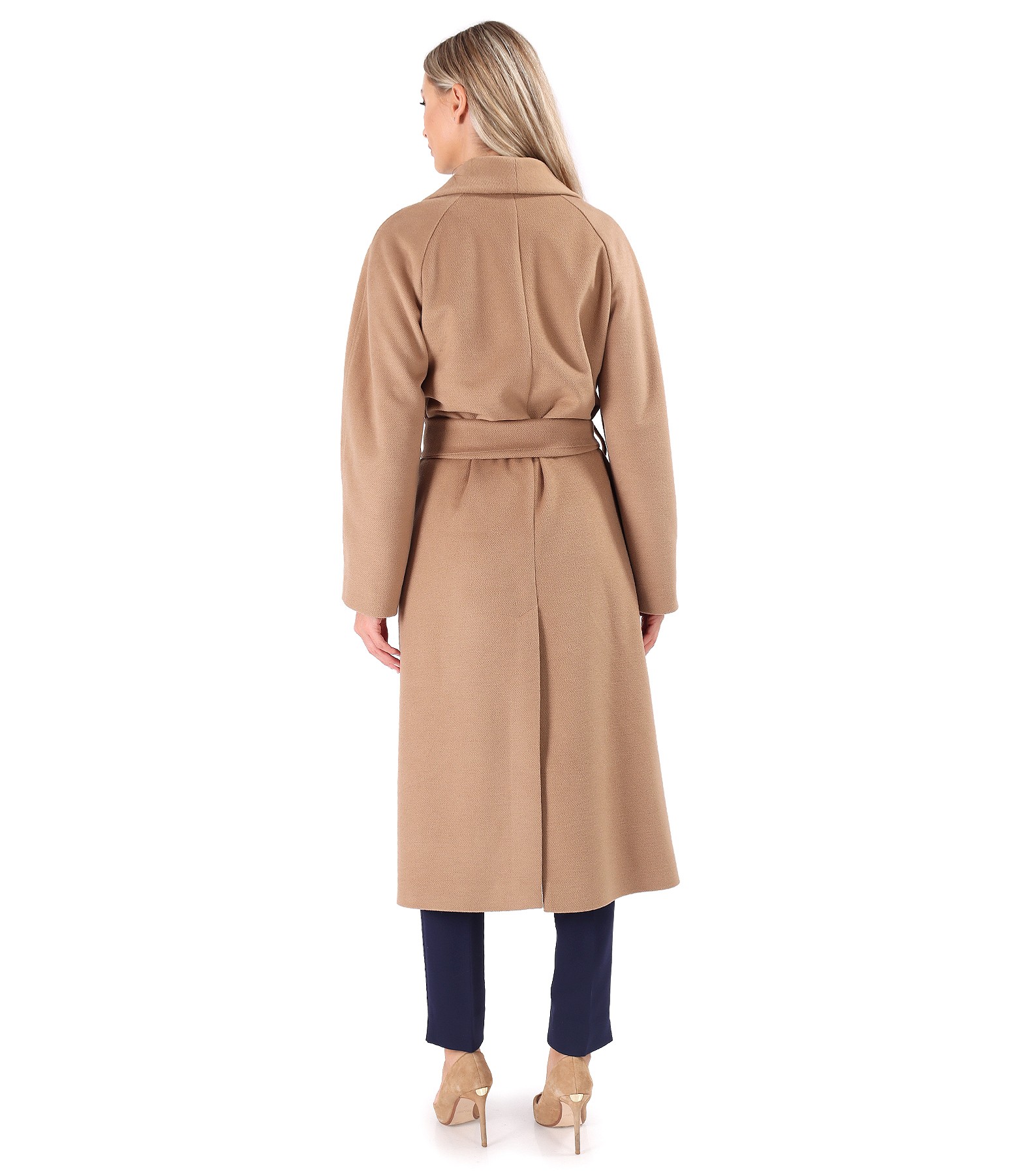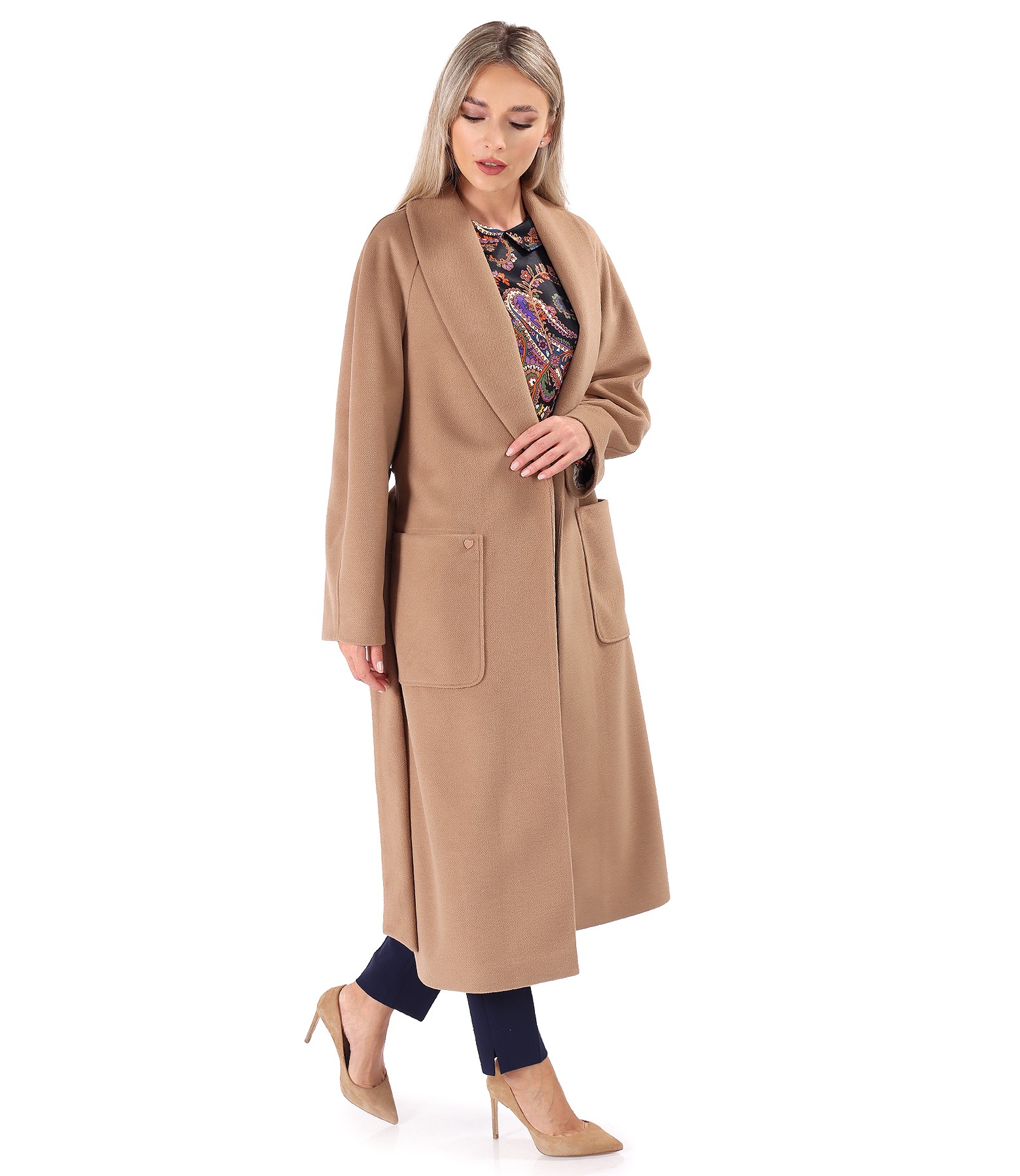 Midi overcoat made of thick viscose fabric, padded, with pockets applied on the front, long raglan sleeves, and a slit on the middle back. It closes with a cord fixed to the side.