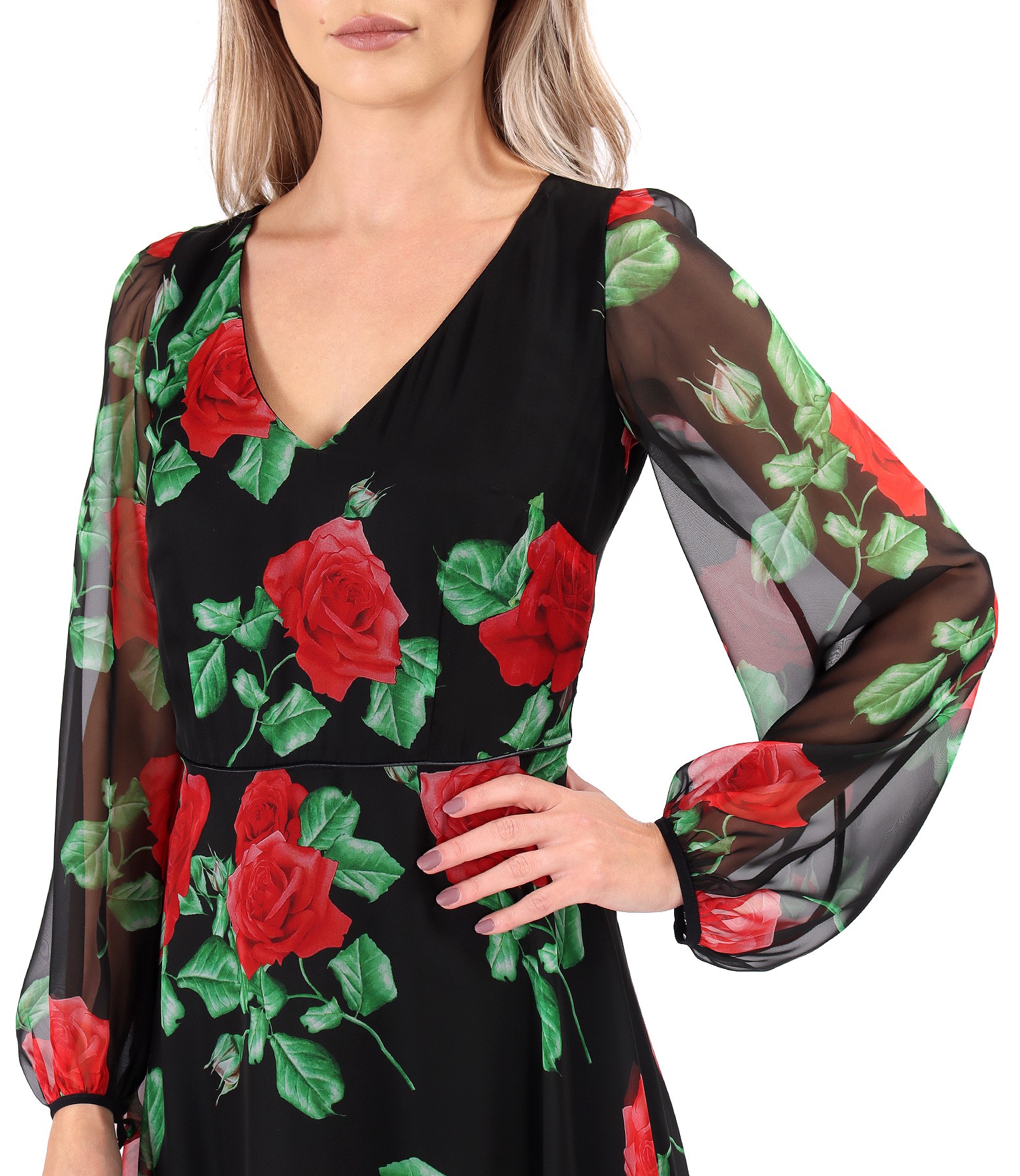 Digitally printed veil midi dress with oversized floral motifs, padded, with long wide sleeves gathered at the end and V-neckline. Closes with a hidden zipper in the middle of the back.