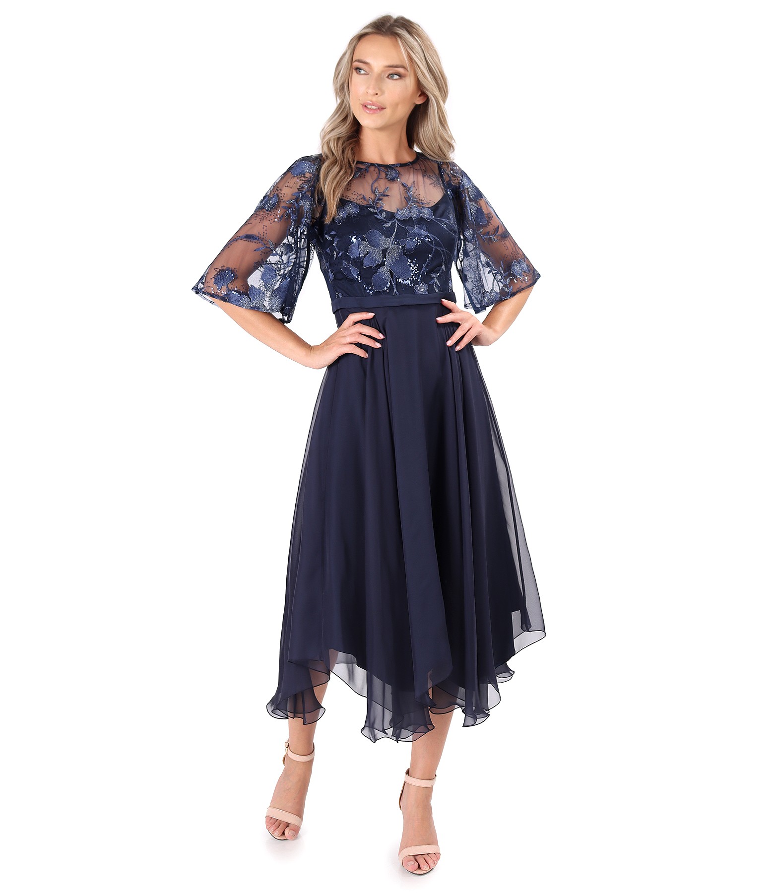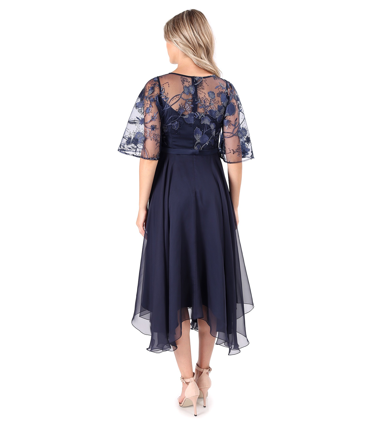 Midi veil evening dress with bodice and veil sleeves with sequins (Navy Blue), size