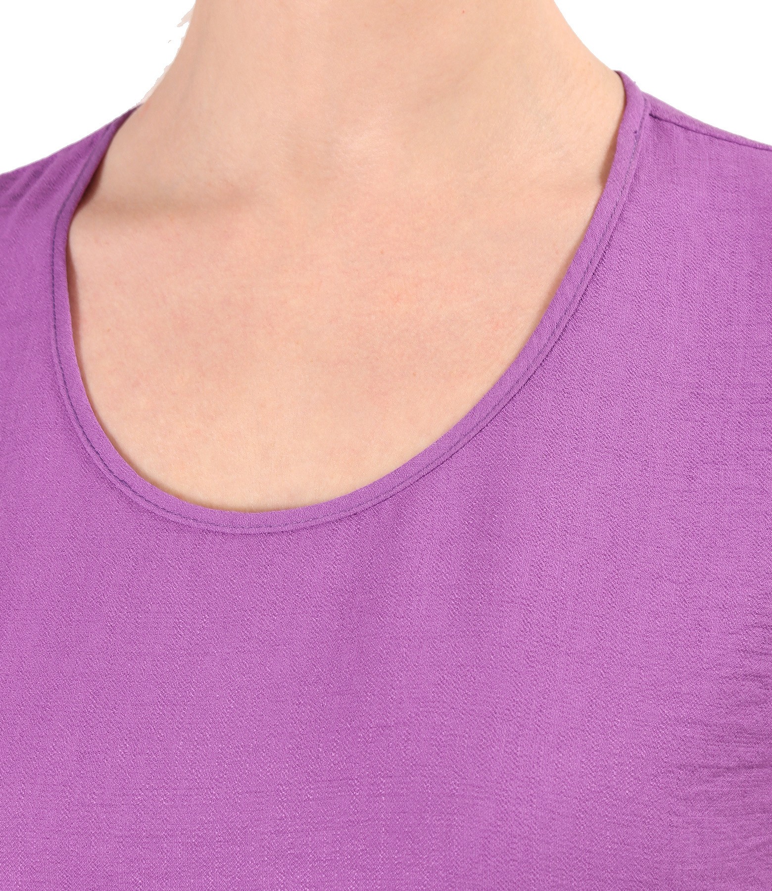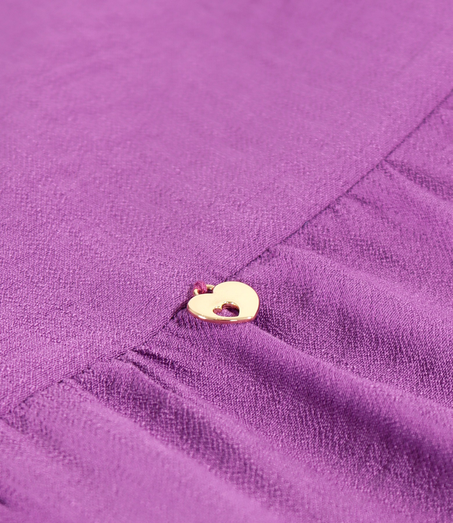 Midi viscose dress with ruffles, with short sleeves, side pockets, and round neckline. It has no closure system.