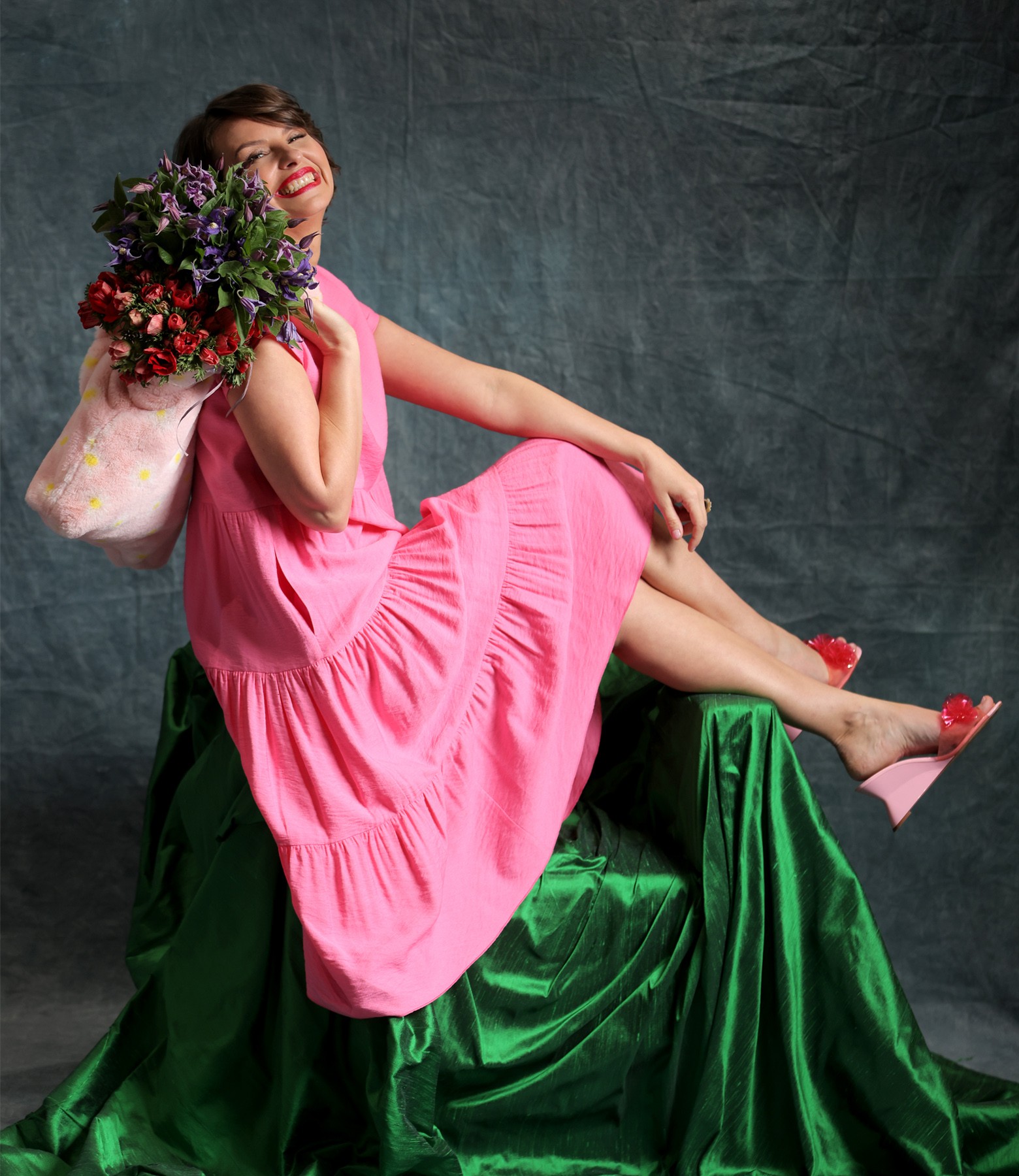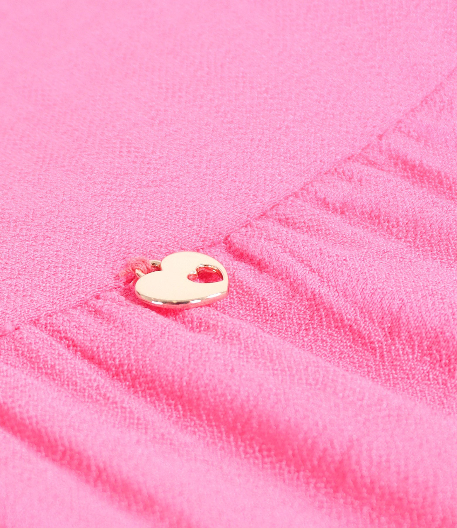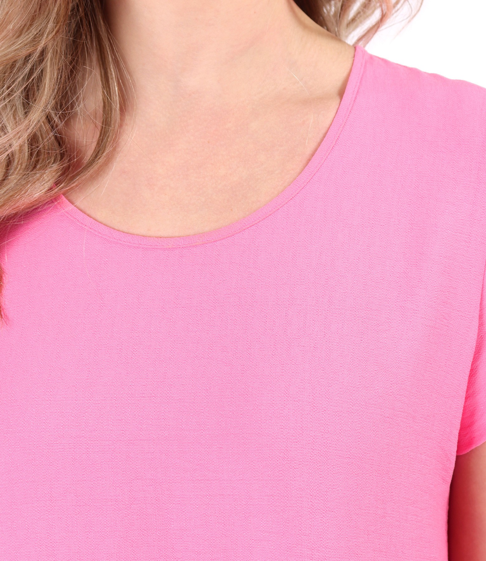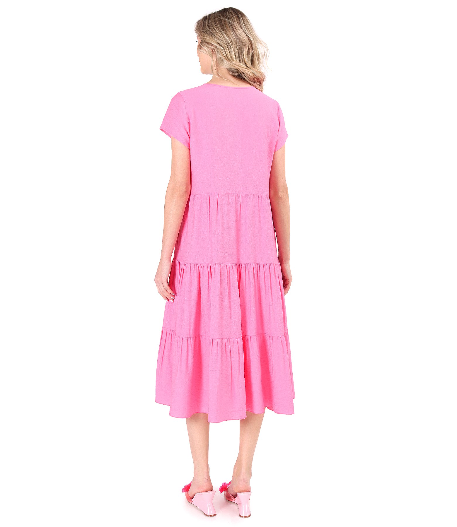 Midi viscose dress with ruffles, with short sleeves, side pockets, and round neckline. It has no closure system.