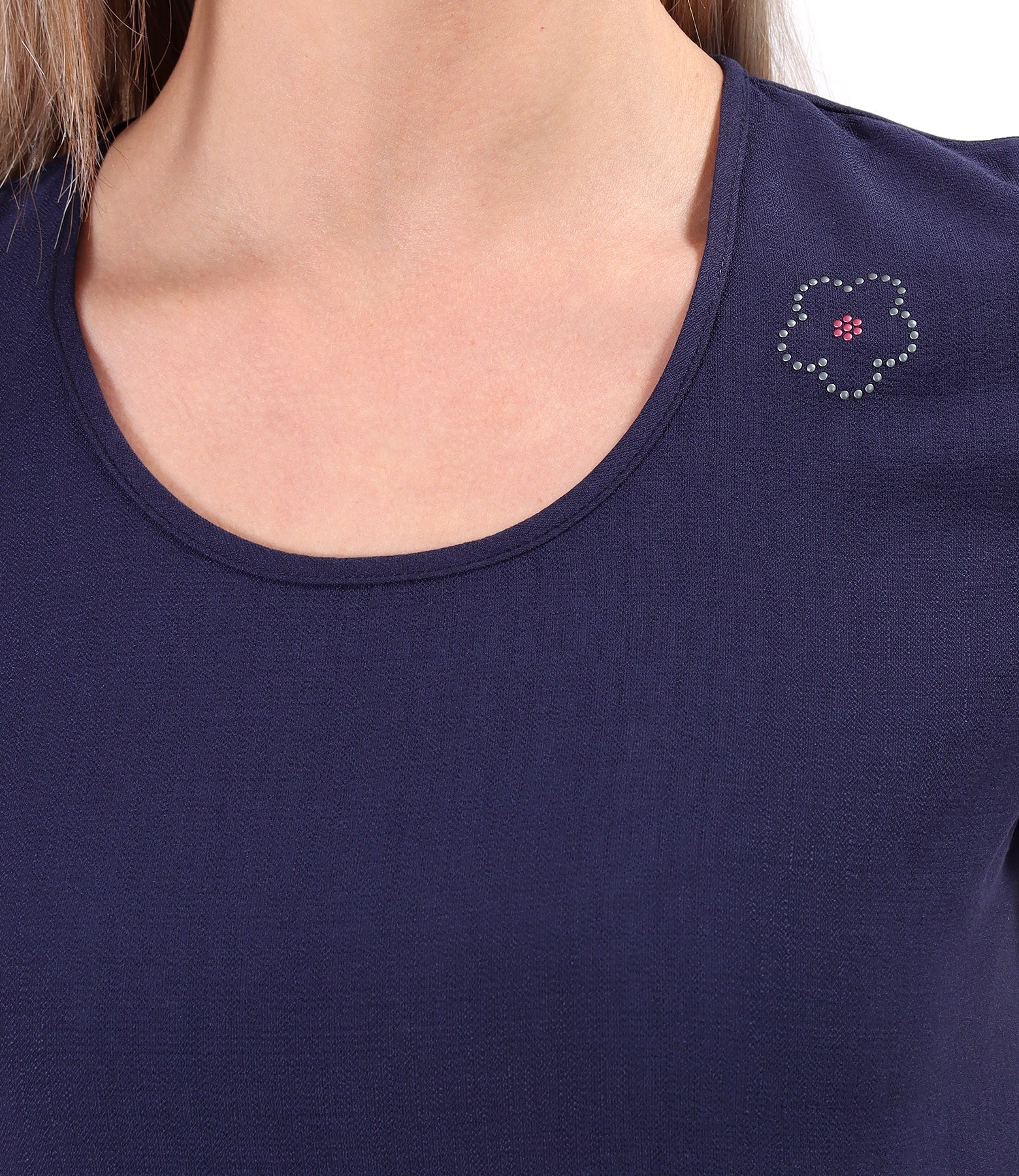 Midi dress with ruffles made of viscose, short sleeves, side pockets, and round neckline with decorative application in the shape of a flower. It has no closing system.