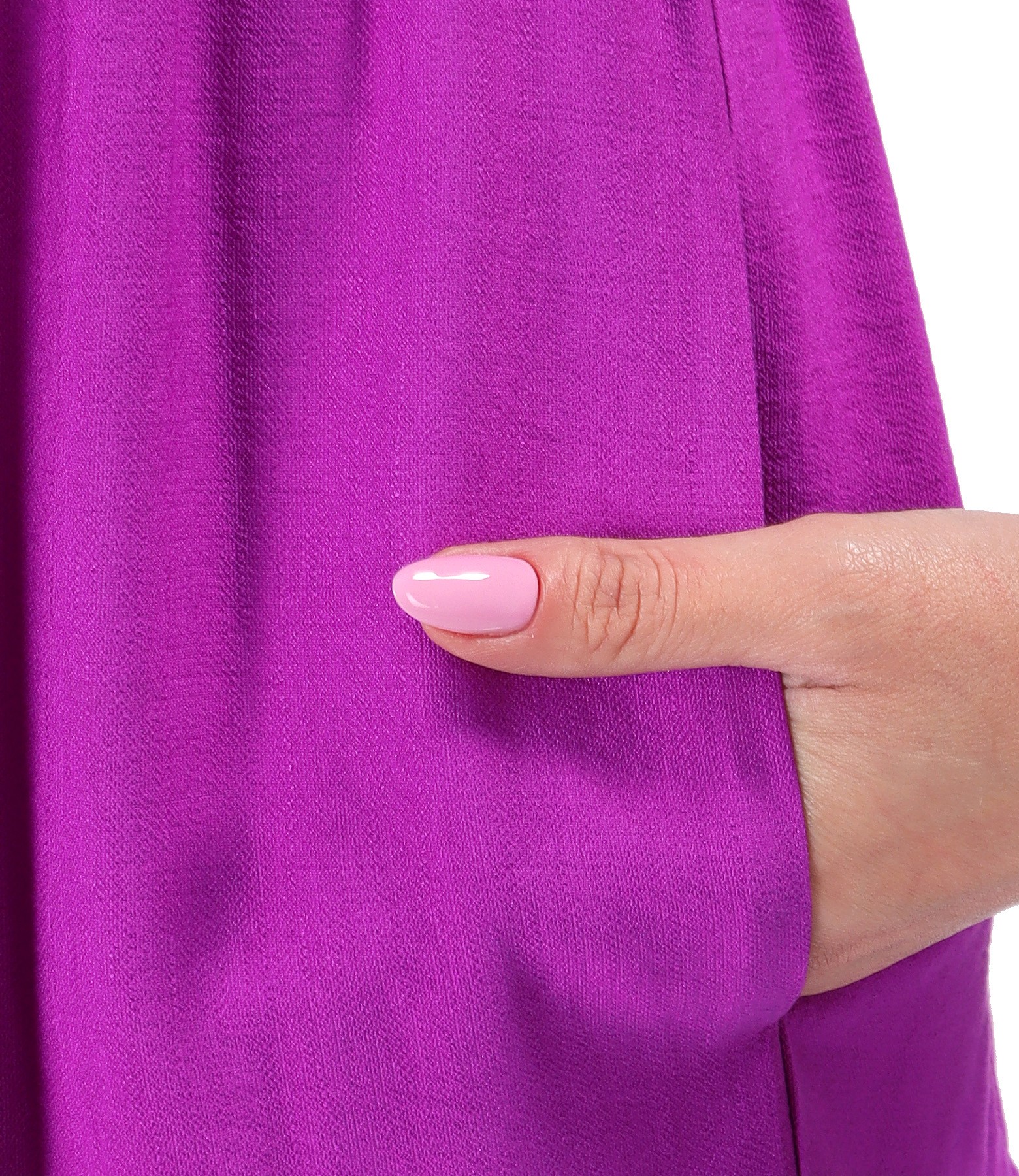 Midi dress with ruffles made of viscose, short sleeves, side pockets, and round neckline with decorative application. It has no closing system.
