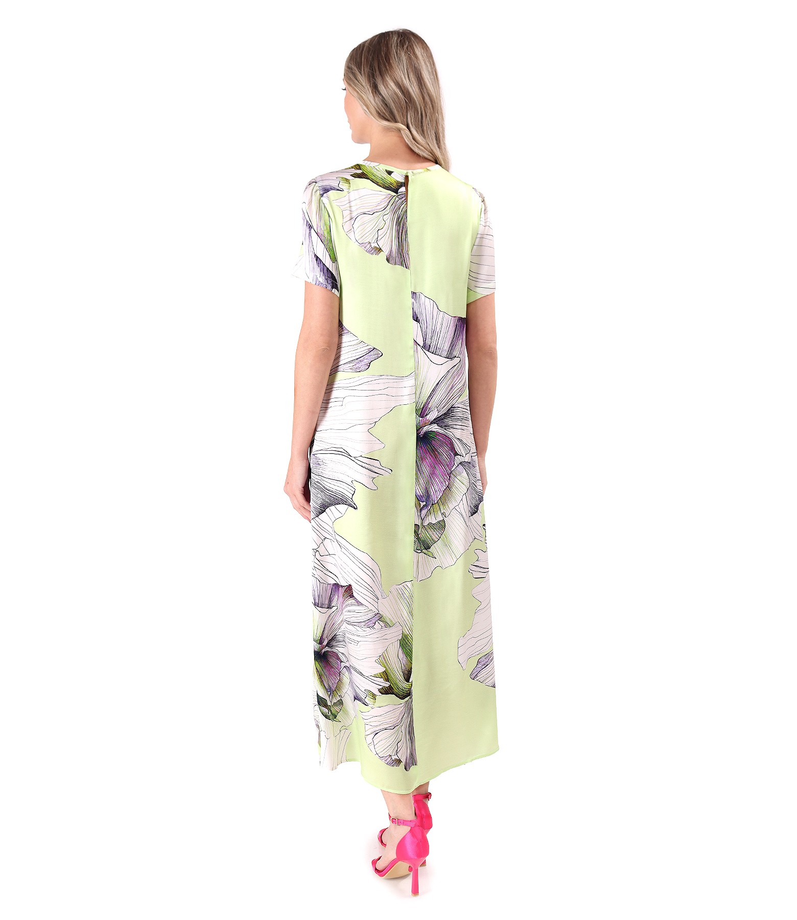 Midi viscose satin dress printed with oversized flowers, round neckline and short sleeves. Closes with a button at the center back.