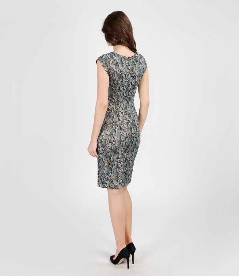Multi-color elastic brocade dress with gold metalic thread, light and confortable with round neckline and fallen shoulders. Middle-back concealed zip fastening.