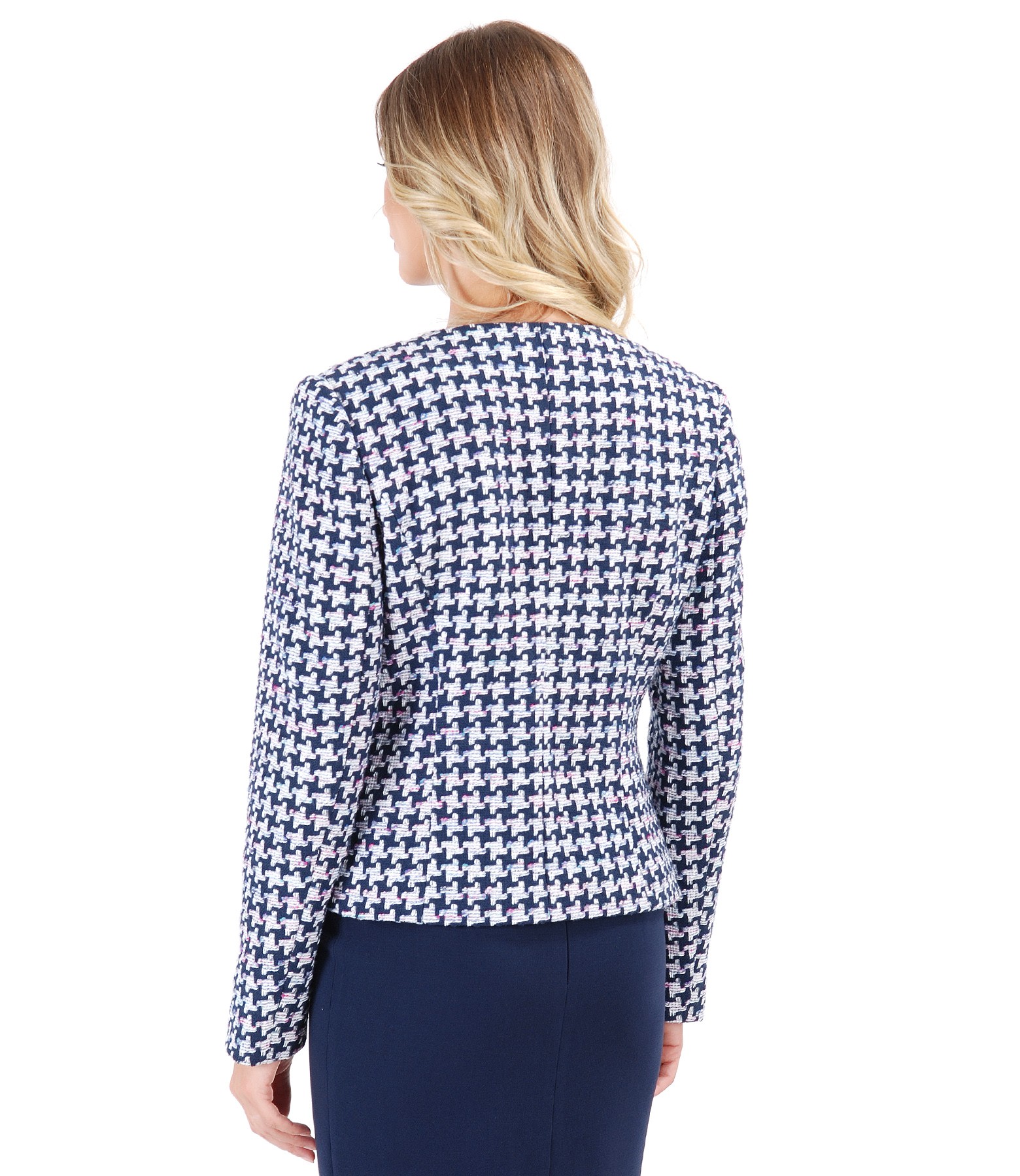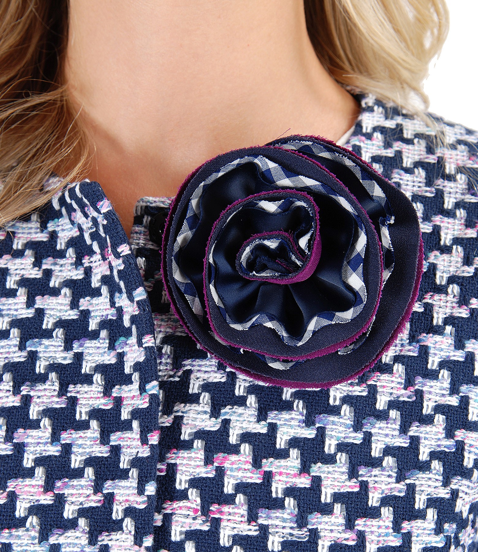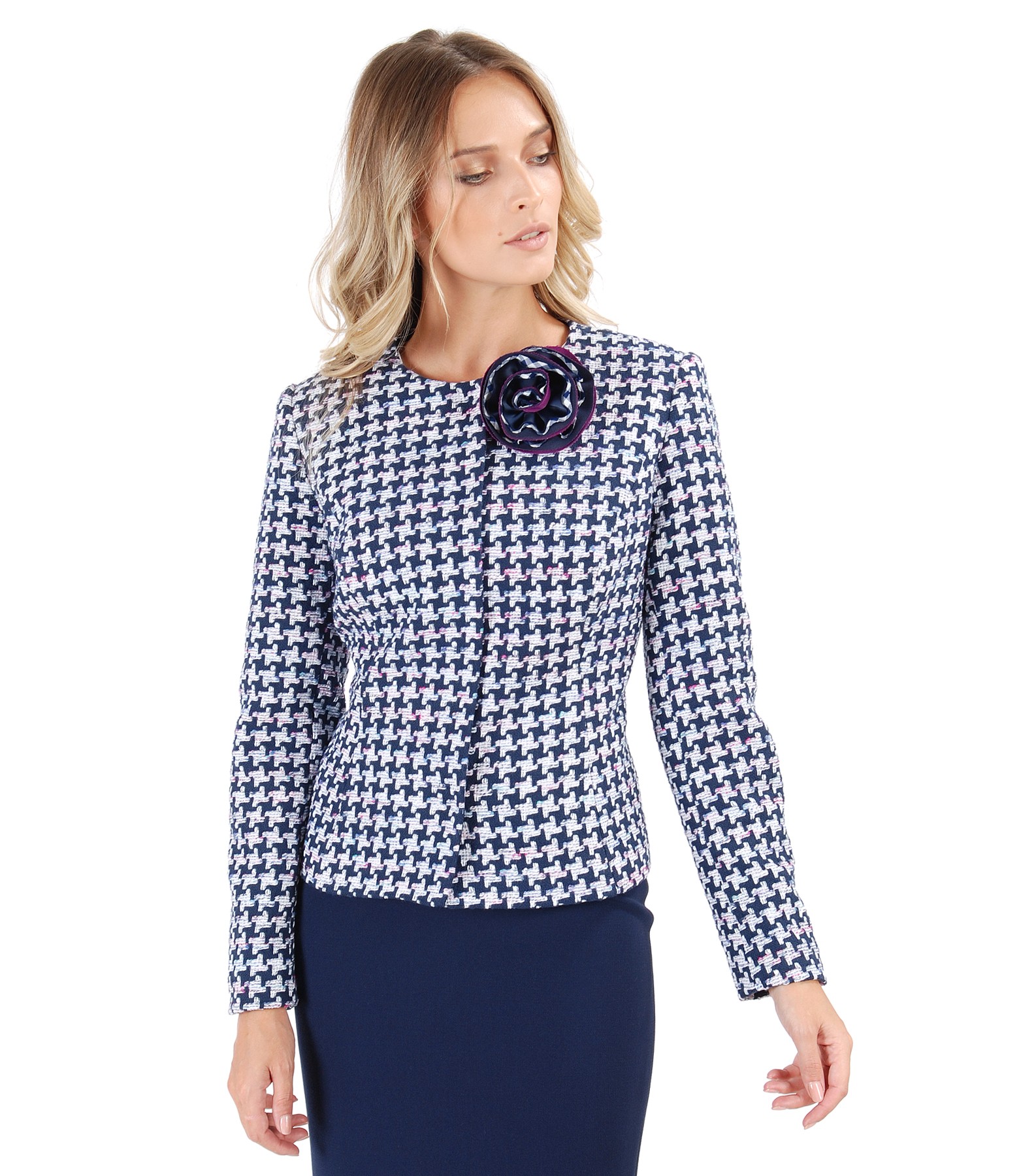 Jacket without collar, made of multicolor loops with cotton, padded, detachable accessory broach on the right side. Closes with 4 front staples.