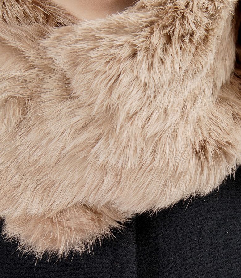 Natural rabbit fur collar, rectangular shape, wrinkled on middle-back. Closed at termination with a hook.