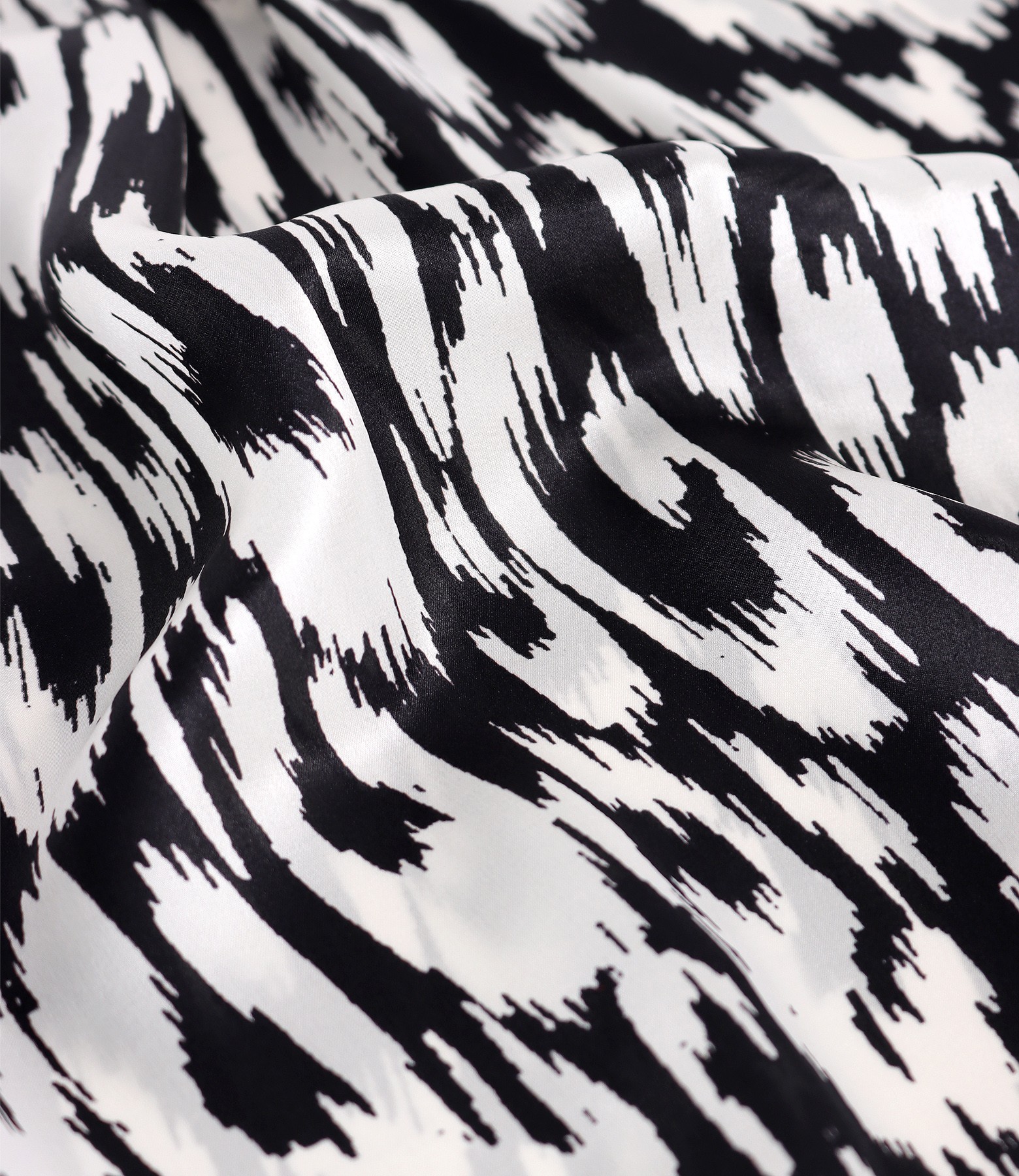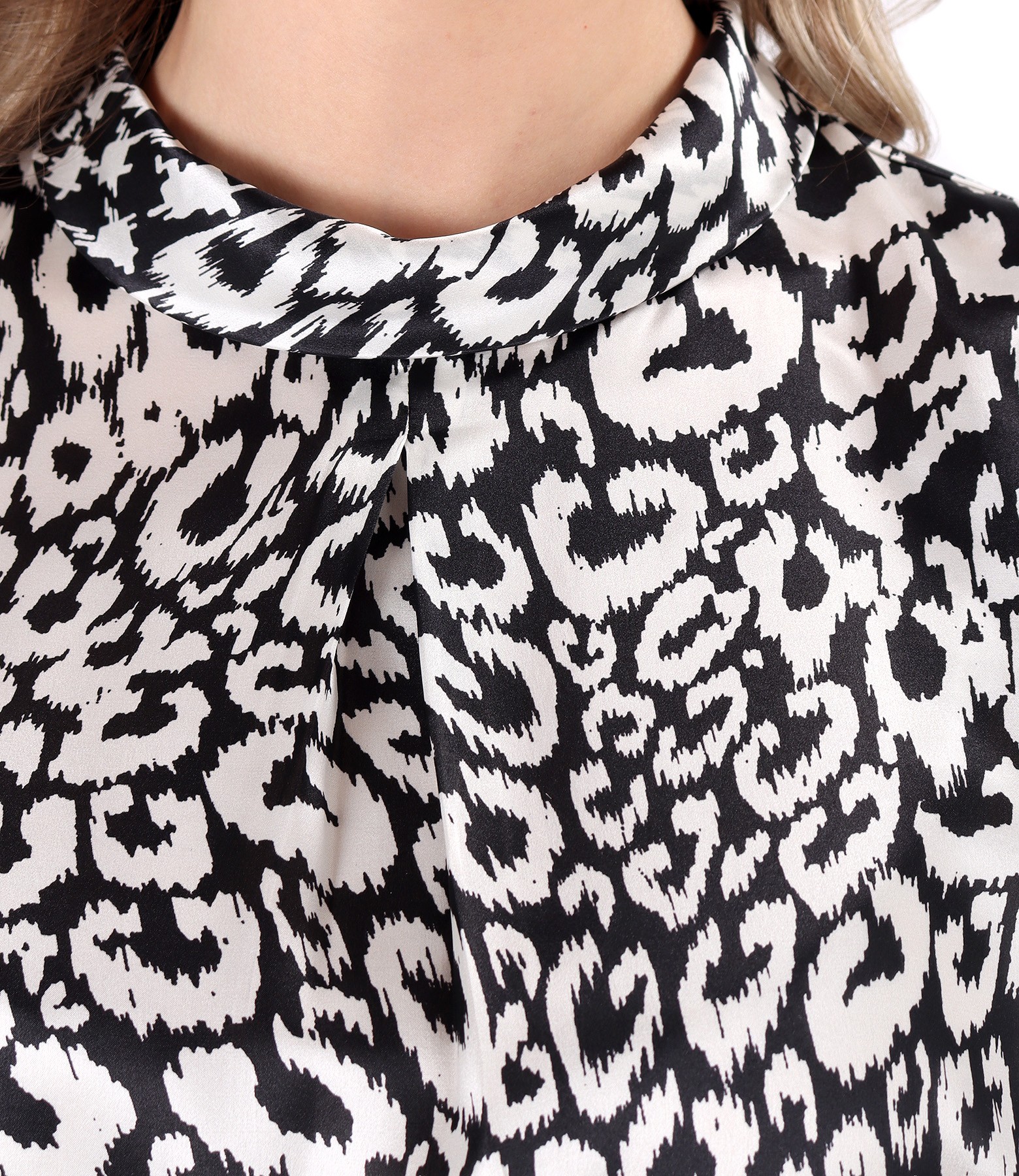 Printed natural silk blouse, 3/4 sleeves, with pleated middle front and round neckline. It closes with a button on the middle back.