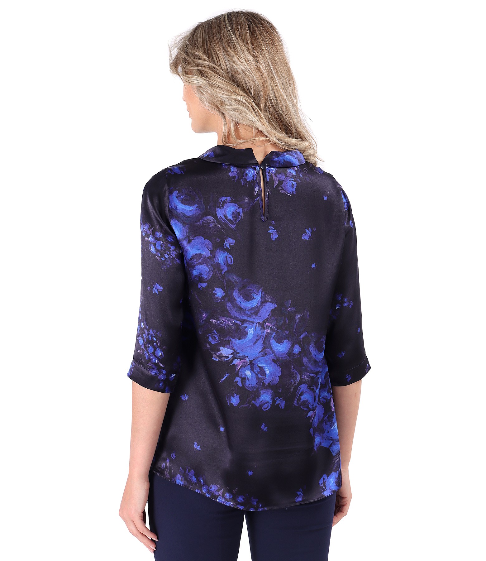 Natural silk blouse printed with floral motifs (Navy Blue), size