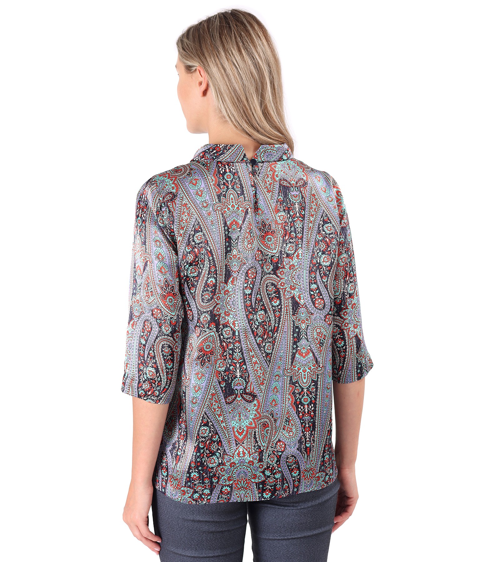 Natural silk blouse printed with paisley motifs, 3/4 sleeves, with fold in the middle of the front and round neckline. It closes with a button on the middle back.