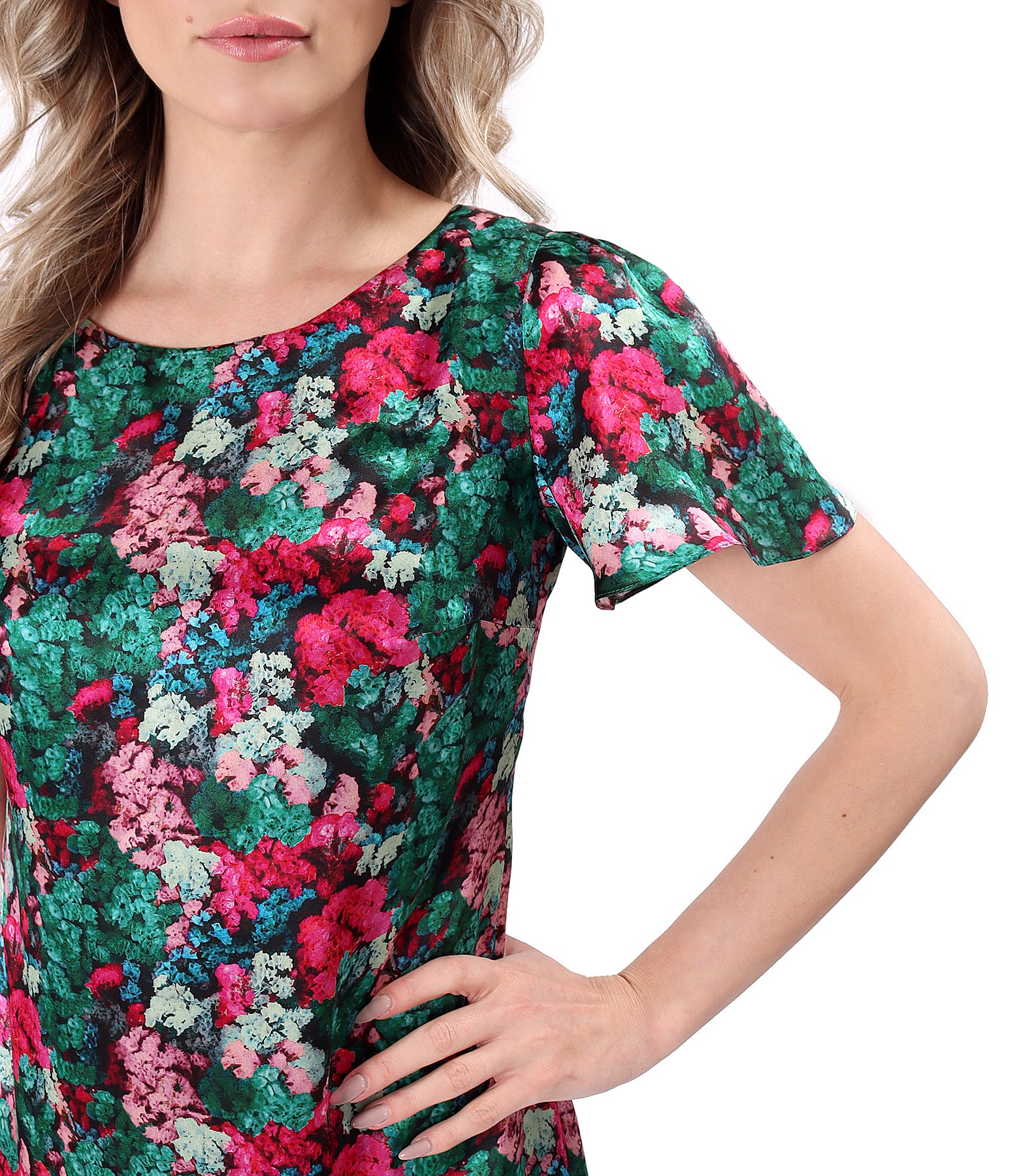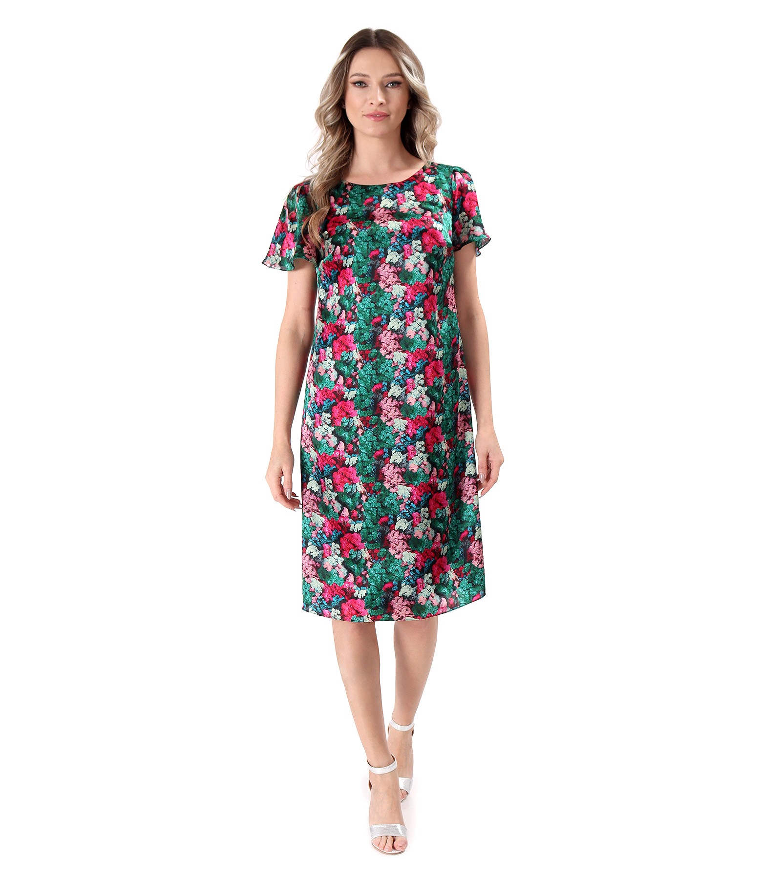 Digitally printed natural silk dress. The dress is padded with viscose and has short sleeves. It closes with a hidden zipper in the middle of the back.