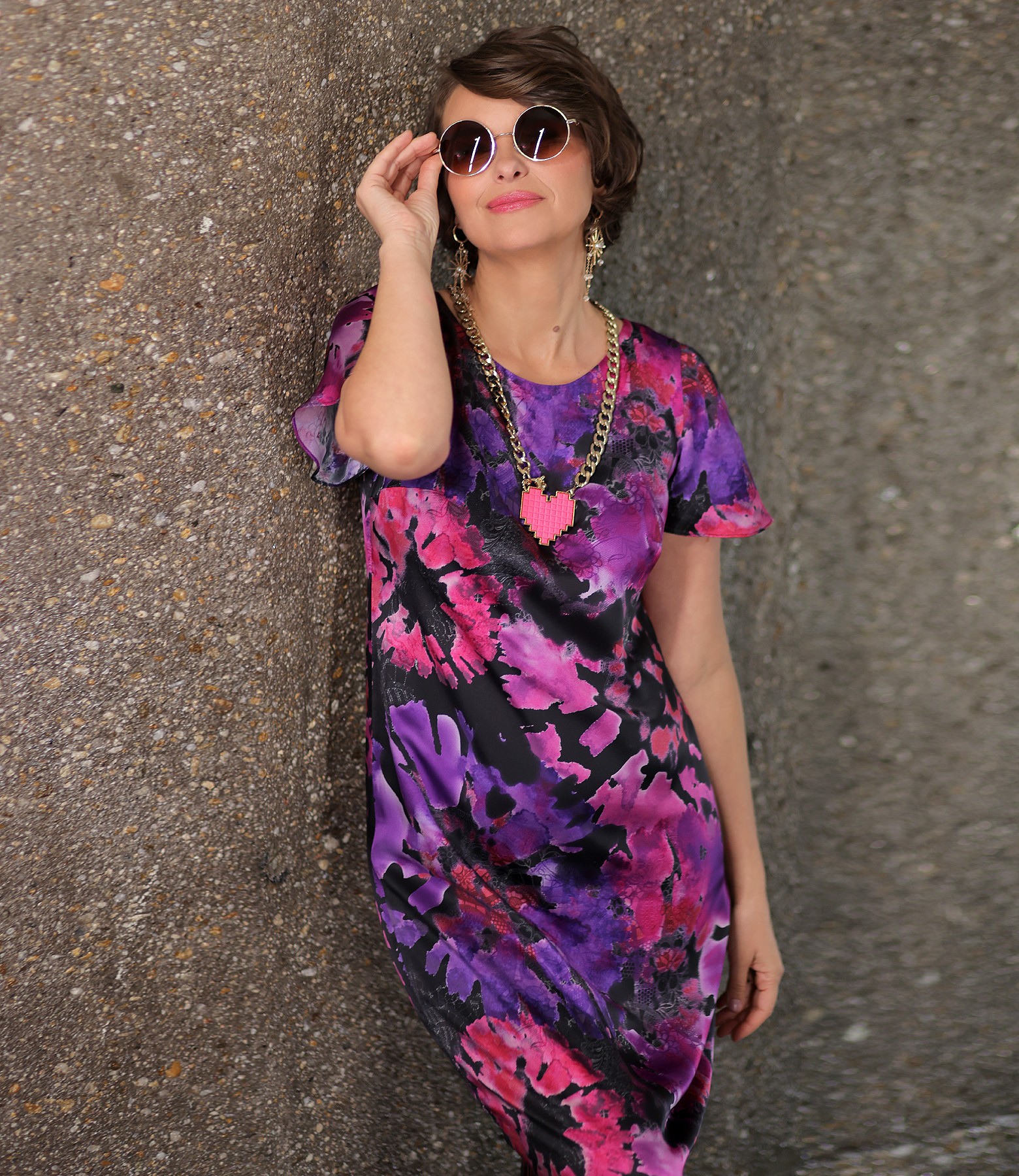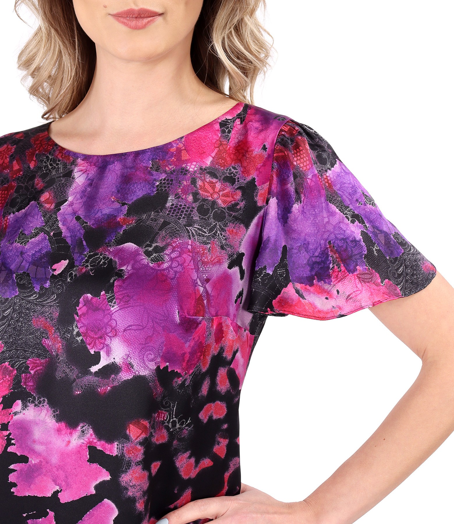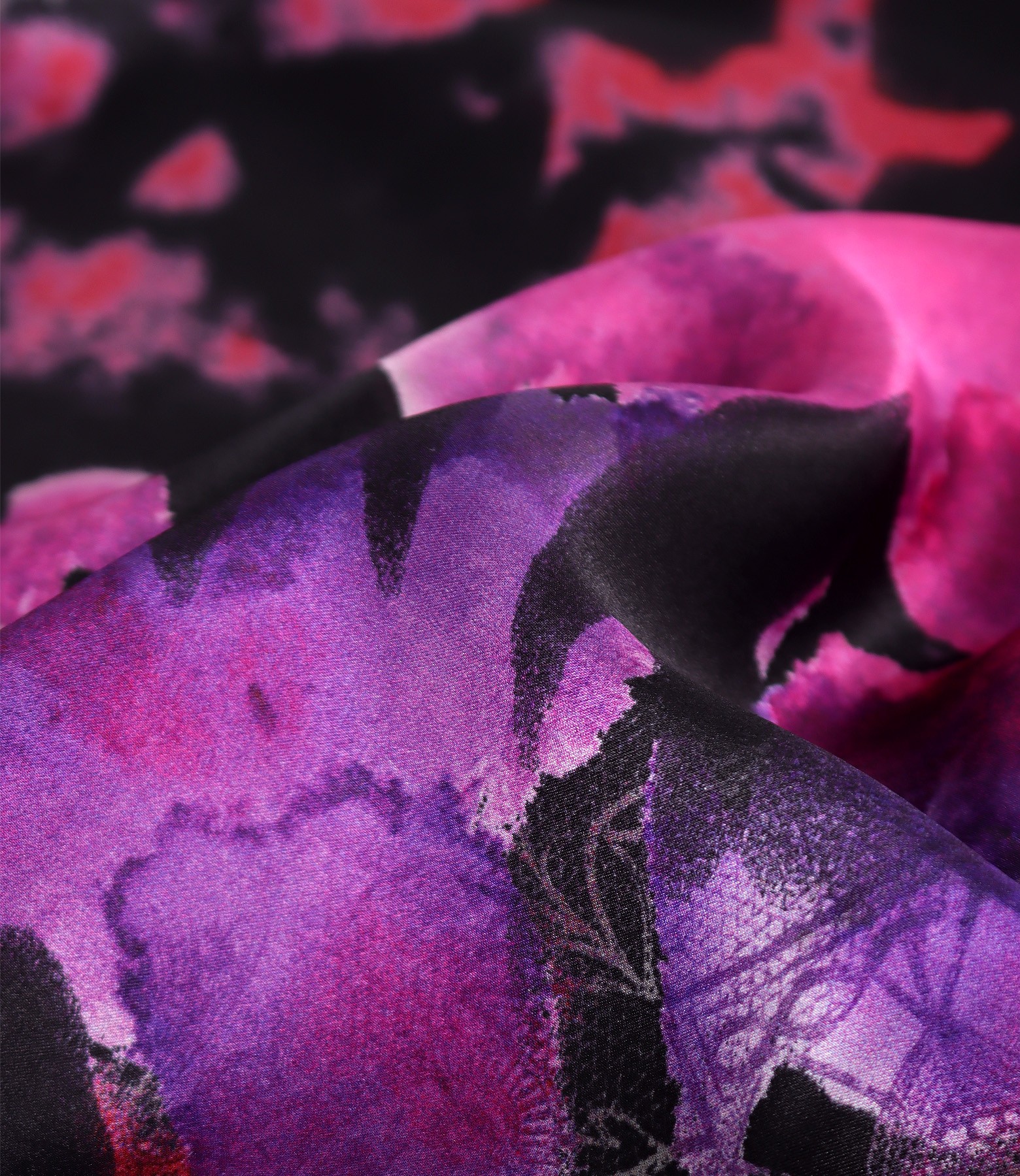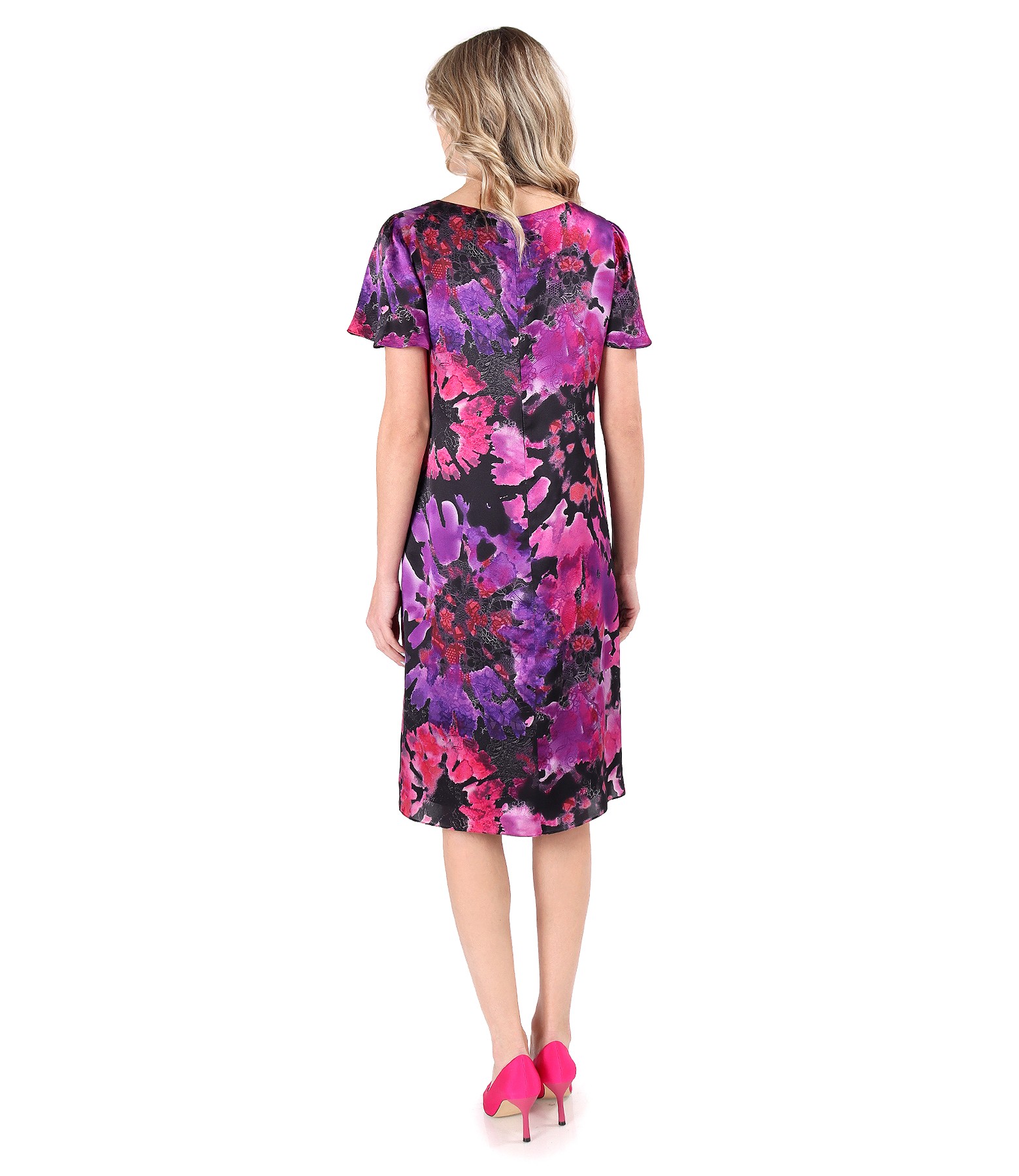 Digitally printed natural silk dress. The dress is padded with viscose and has short sleeves. It closes with a hidden zipper in the middle of the back. The position of the print varies per product.