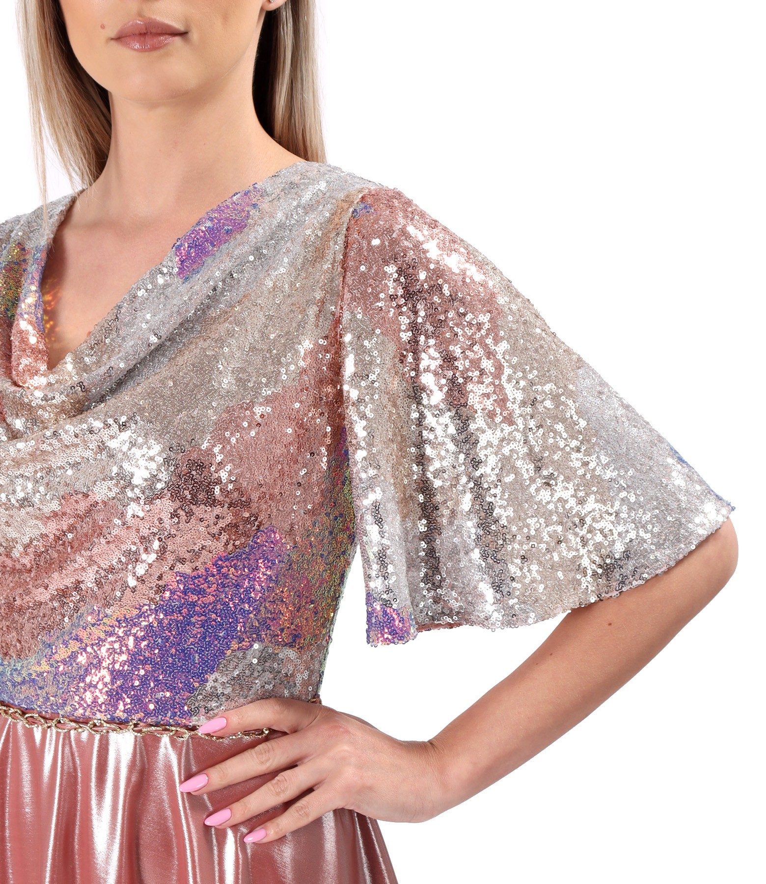 Short occasion dress with sequined bodice and wide sleeves, with pearl veil skirt, padded with elastic satin and pleats at the neckline. It has a decorative golden chain at the waist. It closes with a hidden zipper in the middle of the back.