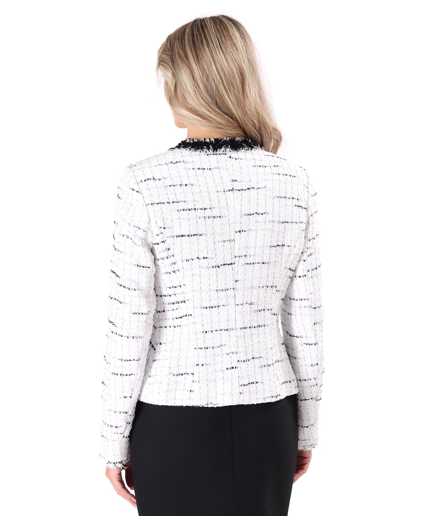 Cotton office jacket, collarless, with a neckline near the neck and fringes at the end of the sleeves. The jacket is decorated with trimmings at the neckline and in the middle of the front. It closes with 5 buttons on the front.