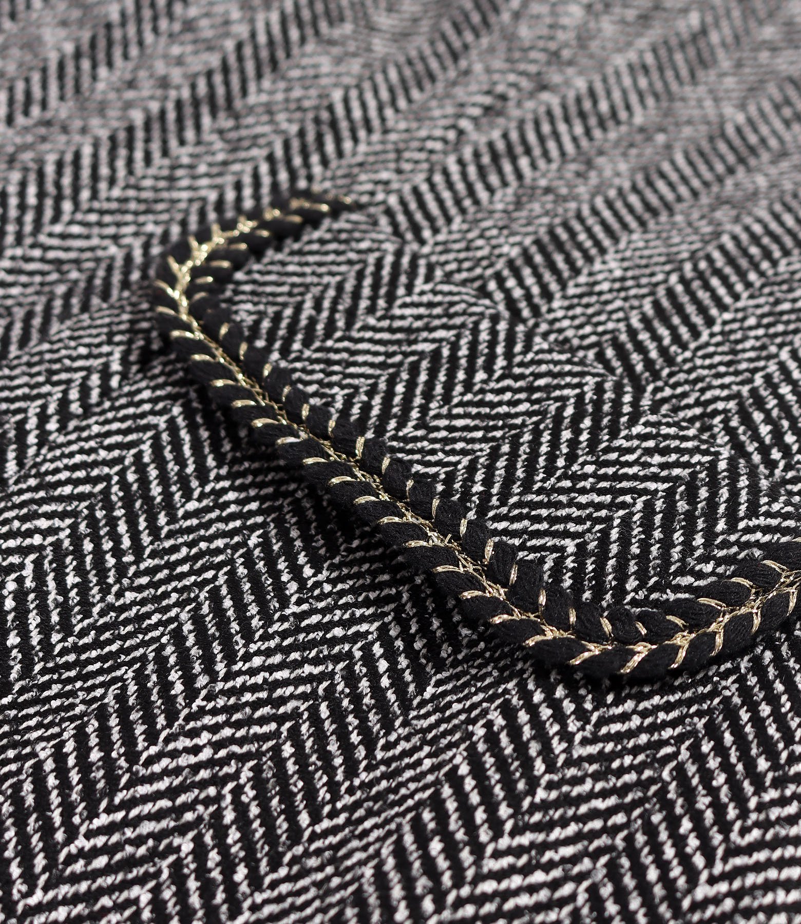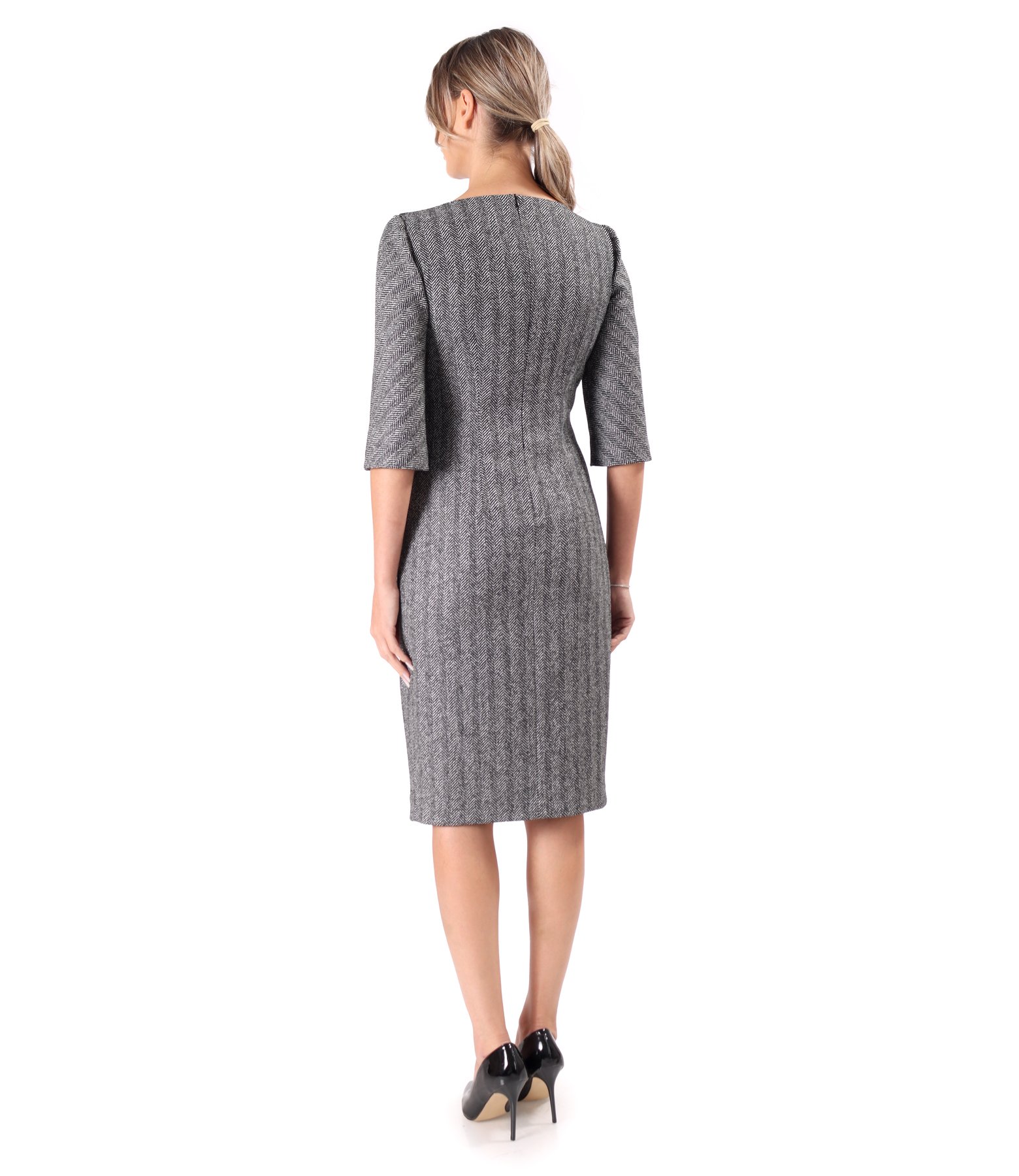 Office dress made of cotton, featuring a V-neckline, 3/4 sleeves, and flaps with black and gold decorative trim. It fastens with a concealed zipper at the center back.