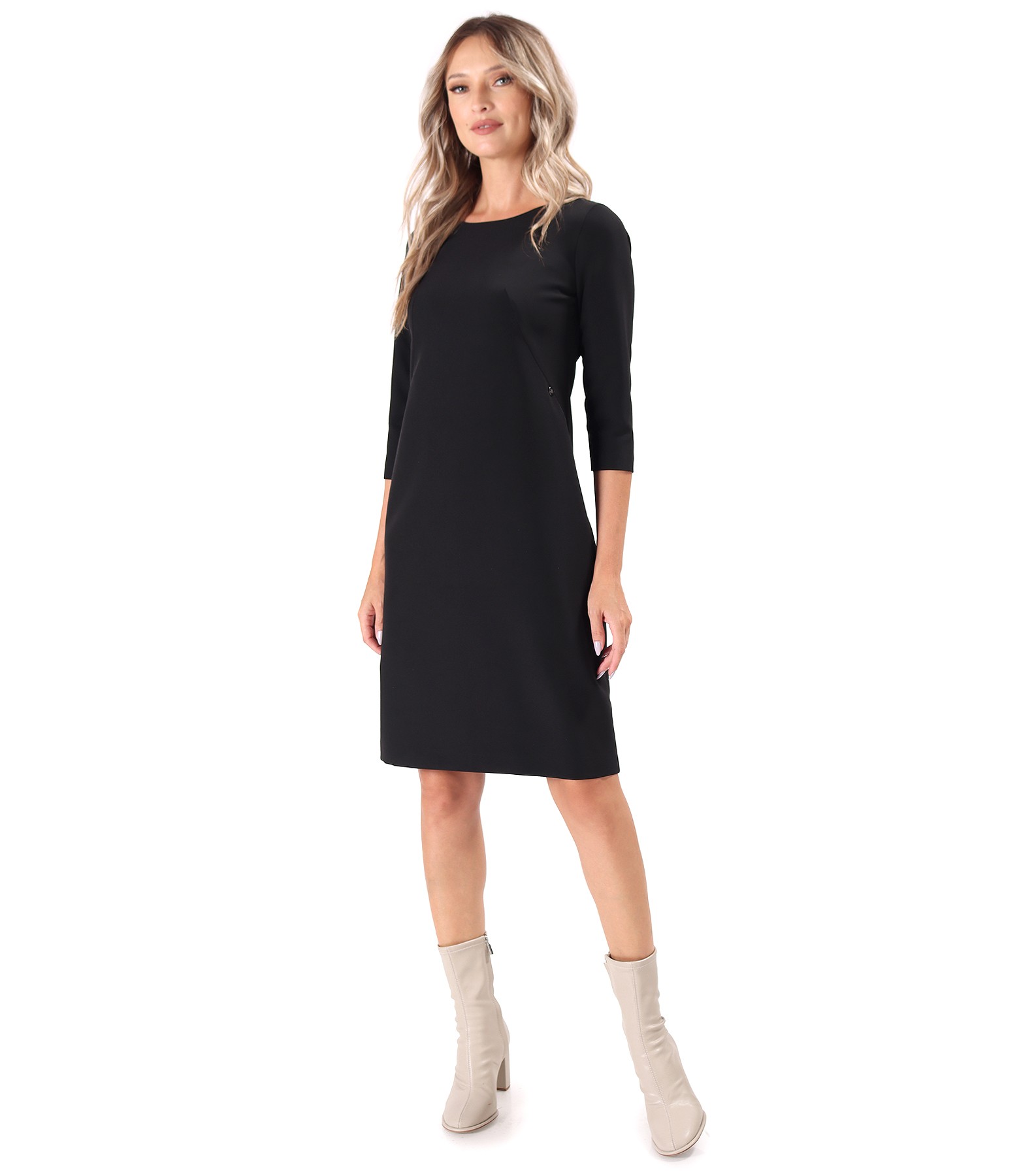 Office dress made of elastic fabric, lined, with 3/4 sleeves and round neckline. It closes with a hidden zipper on the middle back.