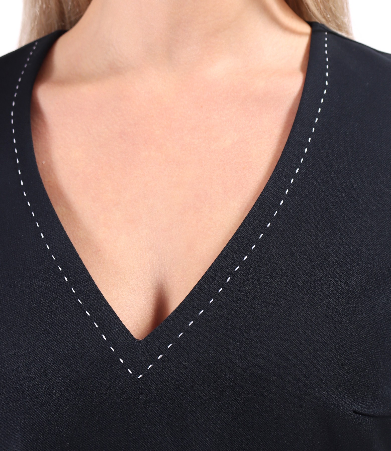 Office dress made of elastic viscose fabric, lined, with 3/4 sleeves, V-neck, side pockets and contrasting decorative stitching at the neckline and sleeve ends. The dress has a slit at the center back. It closes with a hidden zipper at the center back.