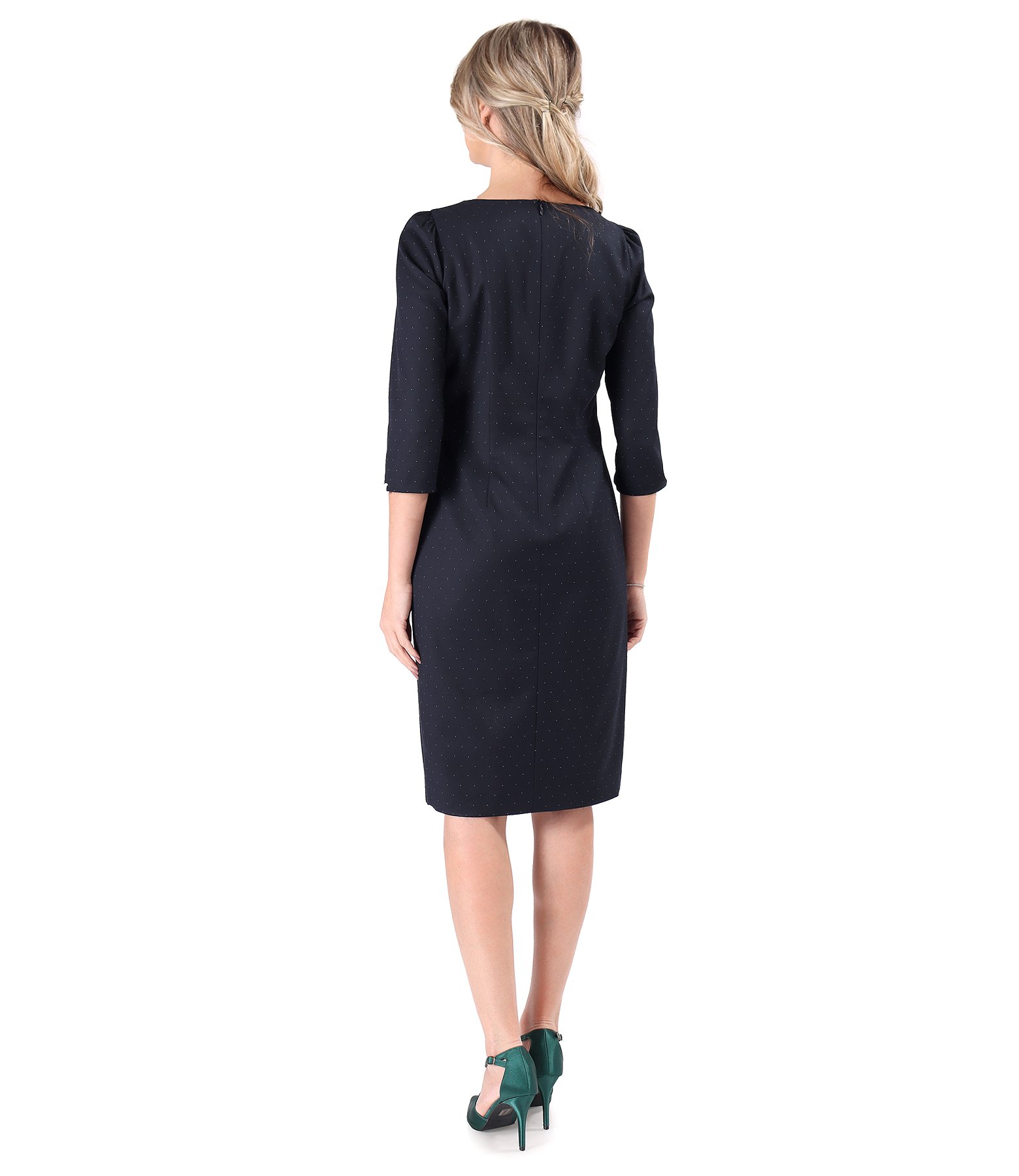 Office dress made of fabric with polka dots, with 3/4 sleeves and a round neckline. It closes with a hidden zipper at the center back.