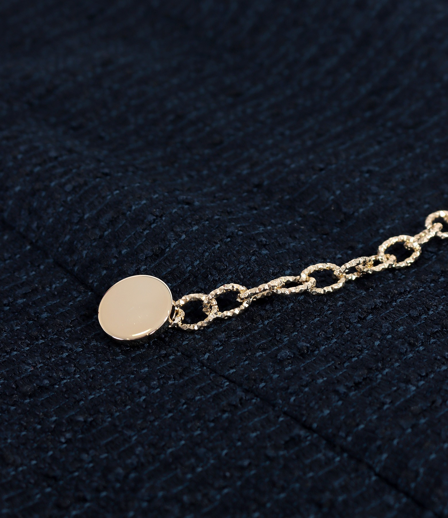 Office dress made of loops with viscose and cotton, padded, with a round neckline, 3/4 sleeves, and decorative golden chain at the waist. It closes with a hidden zipper in the middle of the back.