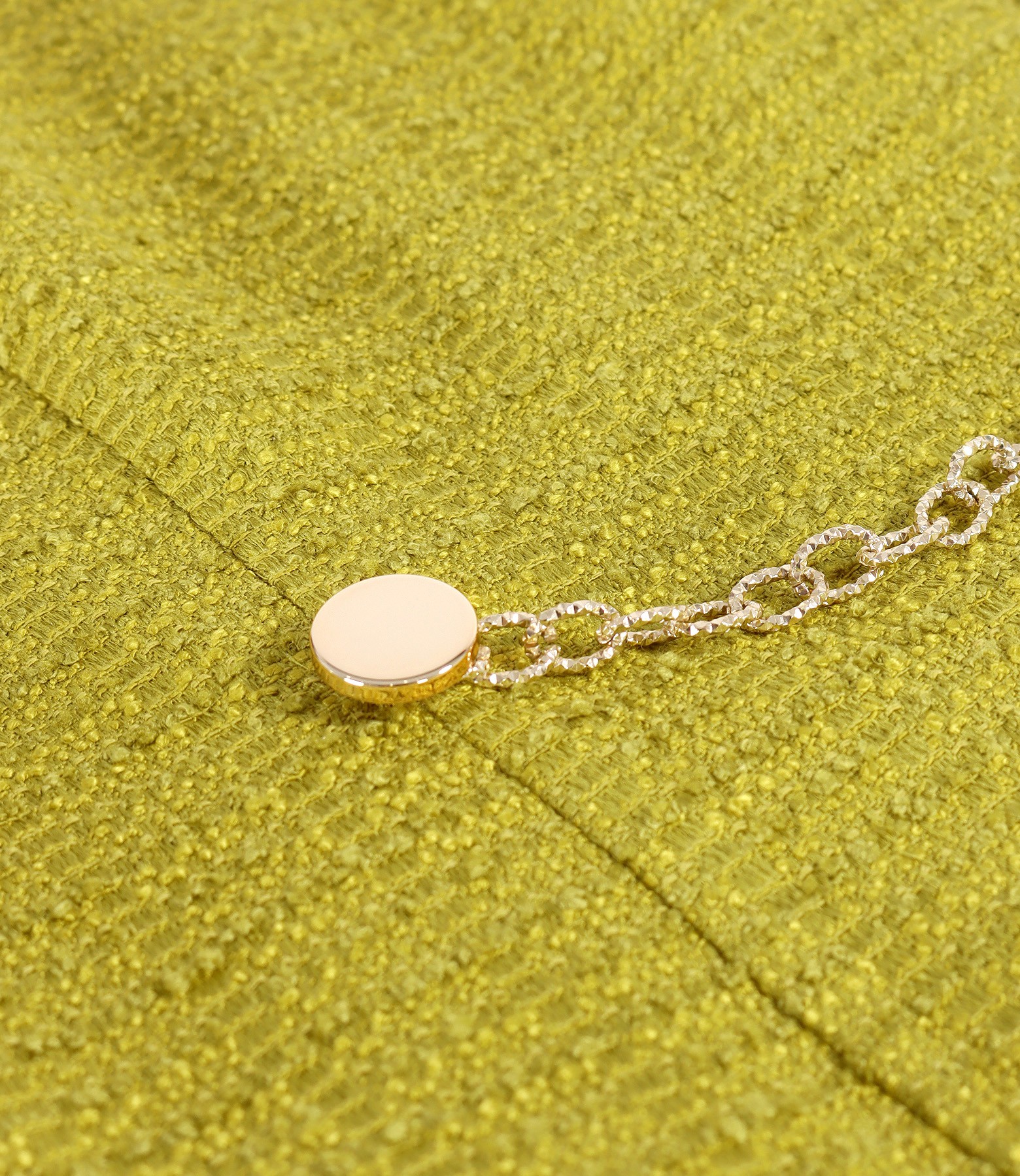Office dress made of loops with viscose and cotton, padded, with a round neckline, 3/4 sleeves, and decorative golden chain at the waist. It closes with a hidden zipper in the middle of the back.